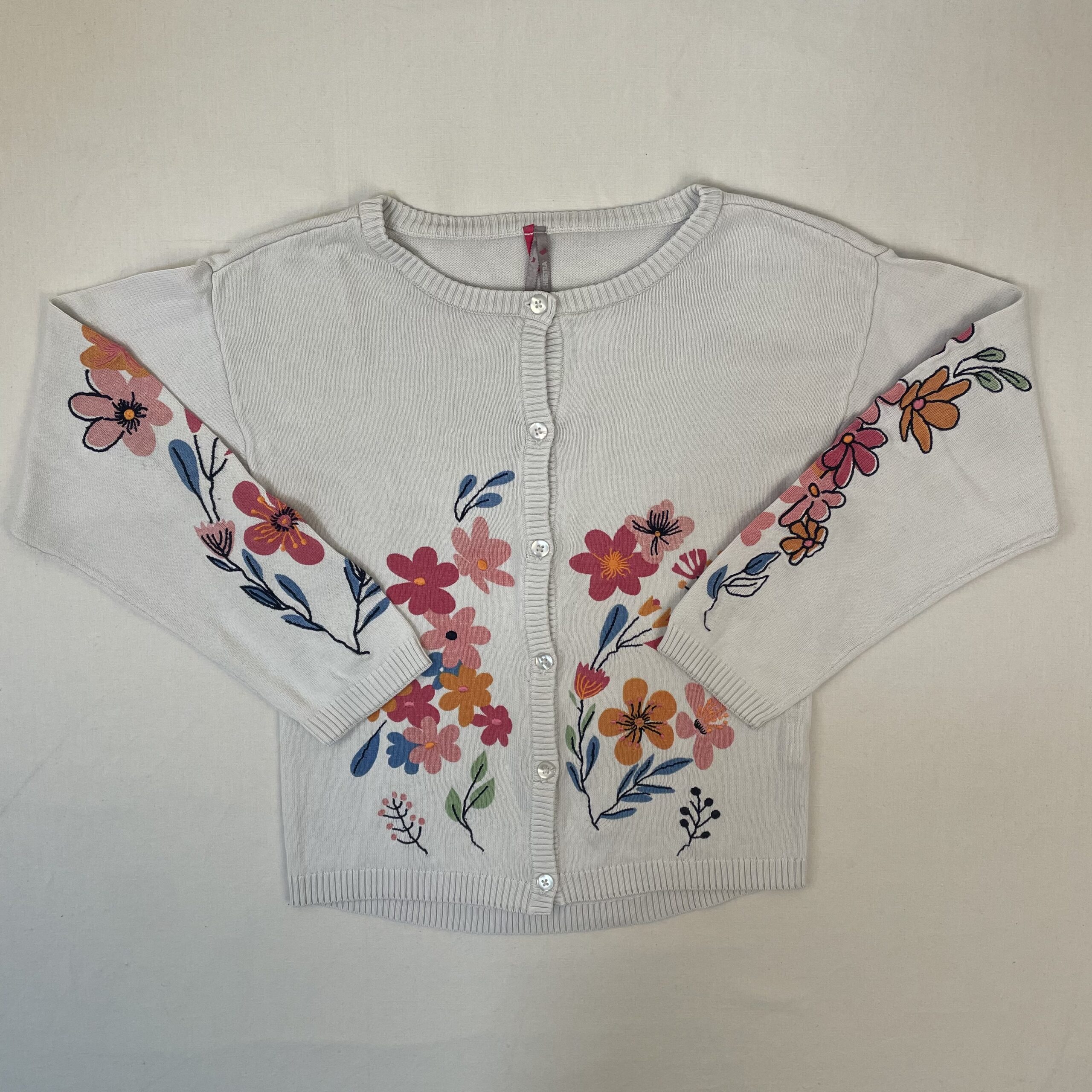 - Gilet/Cardigan blanc avec des motifs de fleurs multicolores à l’avant et sur les manches. Ouverture avec des boutons classiques