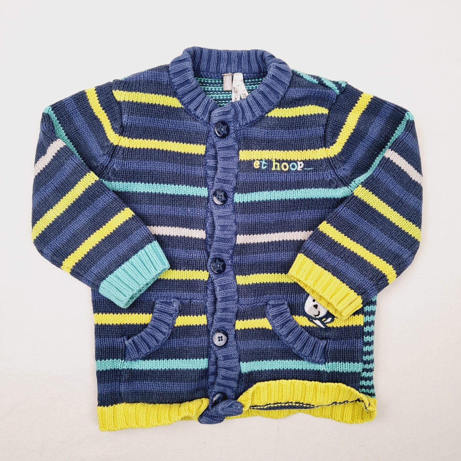 Autres commentaires : Gilet rayé all-over bleu, bleu foncé, jaune, 2 poches devant, encolure ronde, fermeture par boutons, finition bord-côte au col, poignets et à la base, 10% acrylique.