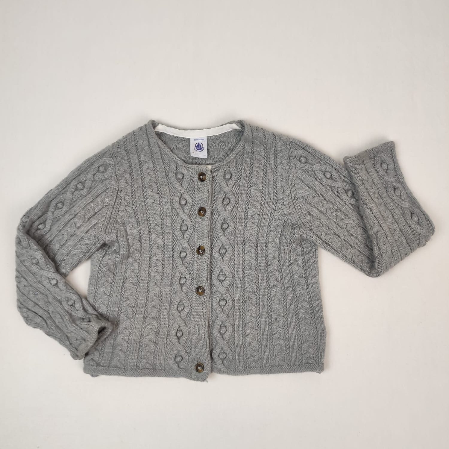 Autres commentaires : Gilet gris en mailles torsadées, col rond, fermeture par boutons devant.