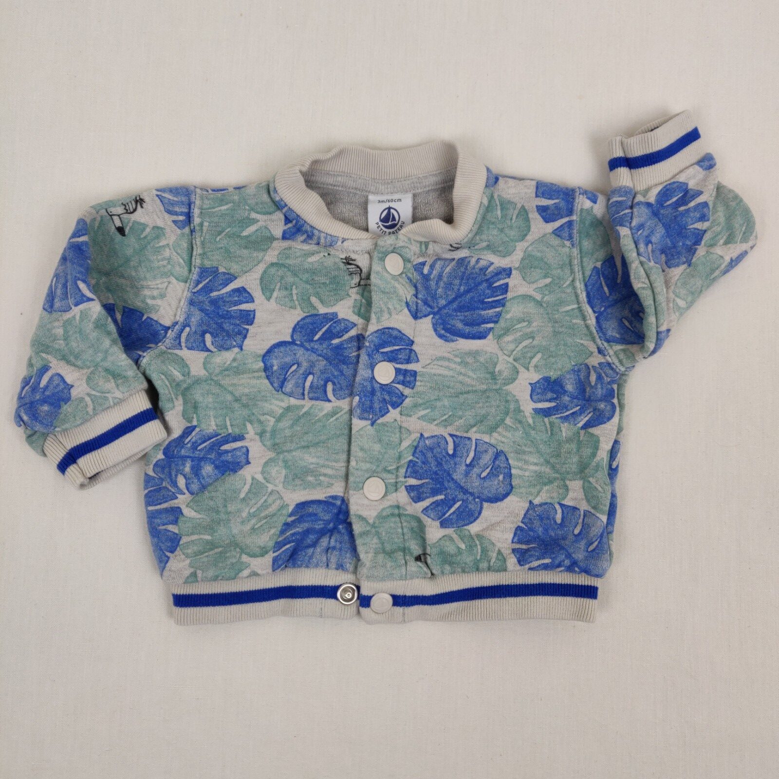 Autres commentaires : Gilet en moleton léger, motifs feuilles et toucans cachés. Fermeture par boutons pression.