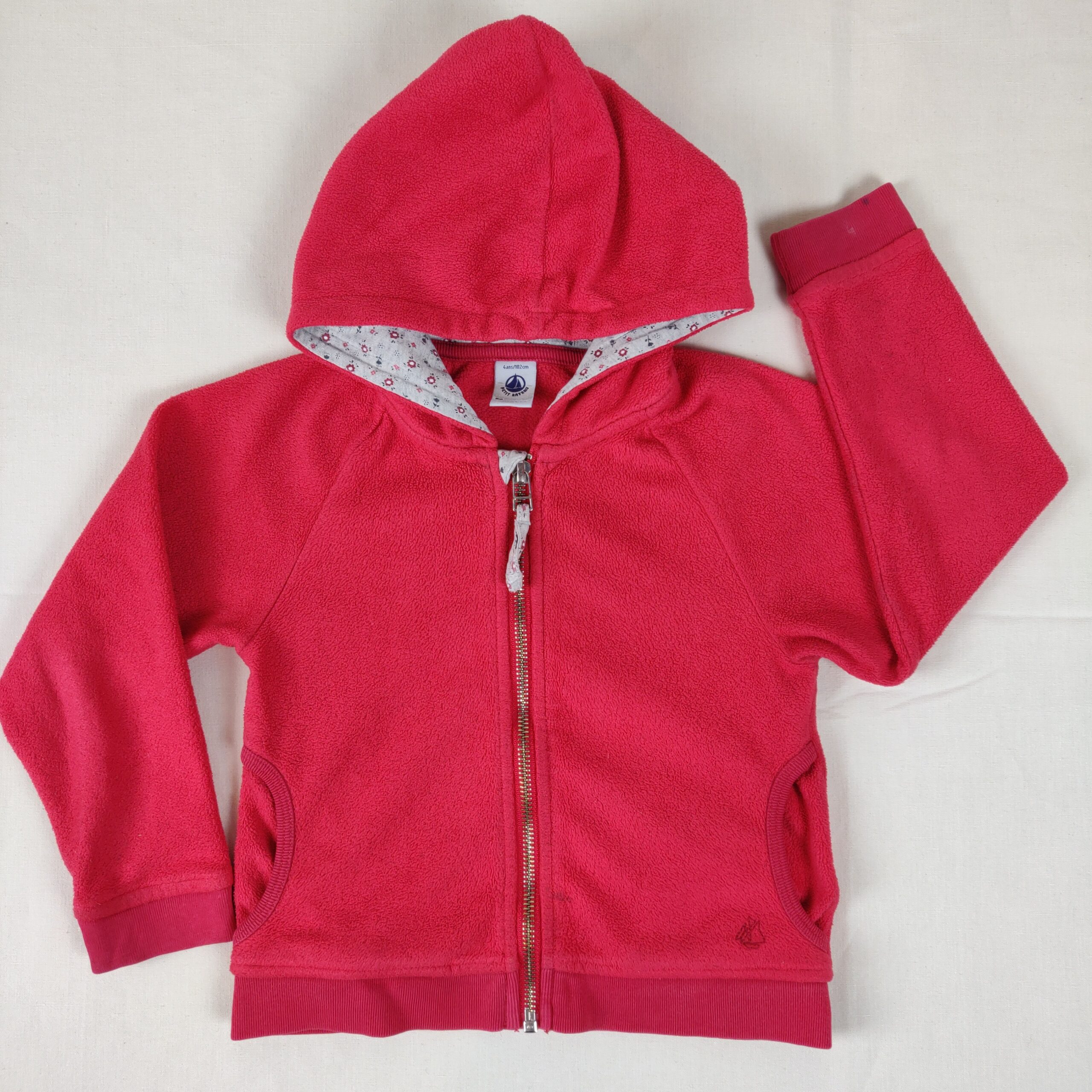 Autres commentaires : Gilet rose corail en polaire à manches longues. Doublure 100% coton. Fermeture éclair métallique. Capuche doublée en tissu gris fleuri. 2 poches sur les côtés. Manches et bas élastiques. Petite tâche bleue vers le bas du devant et lègères traces d’usure sur les coudes.
