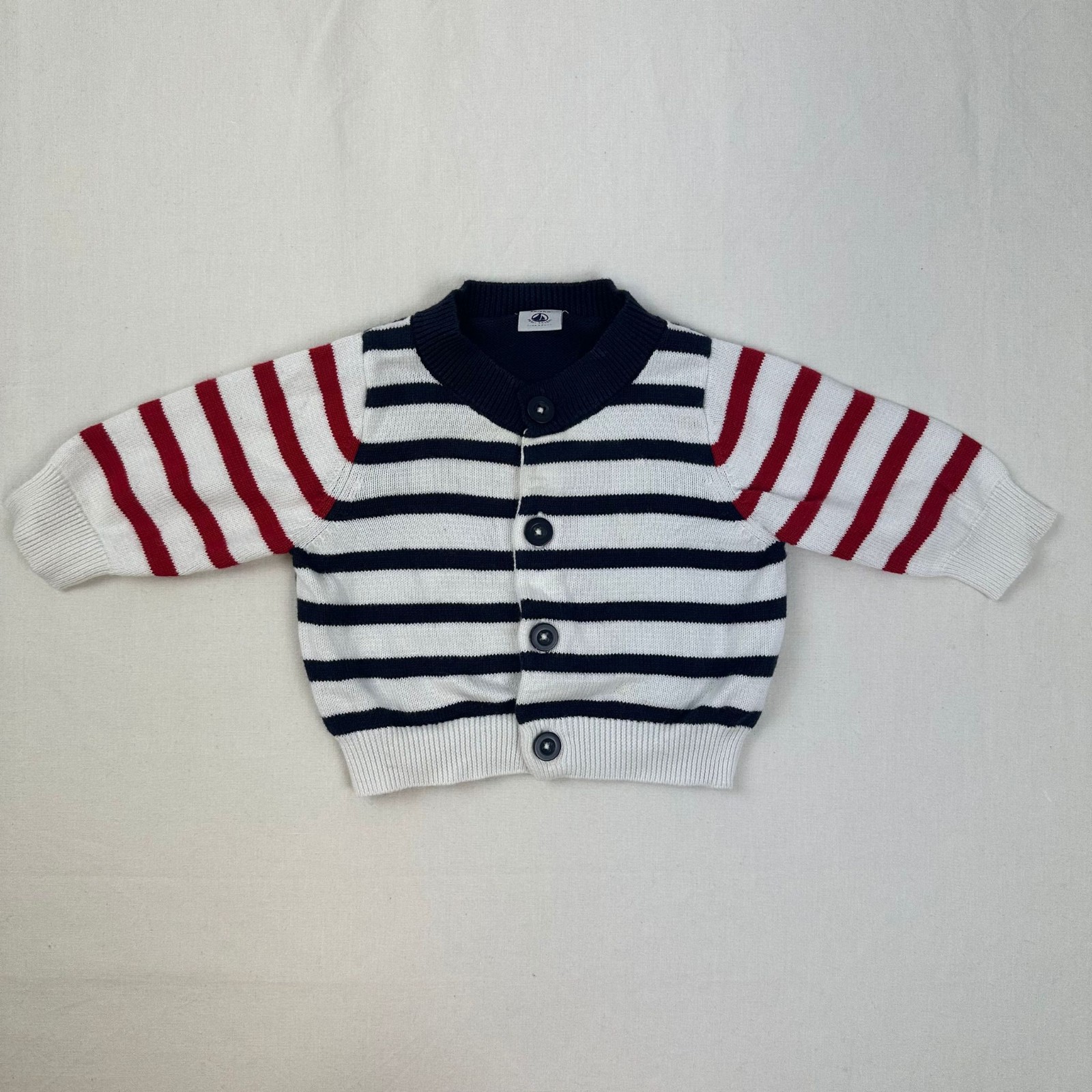 Autres commentaires : Gilet manches longues blanc avec rayures rouge et bleu foncé avec une fermeture devant par boutons. Petit défaut: petite tâche jaune sur la devanture à gauche du gilet.Niveau réduit de fraise à myrtille.