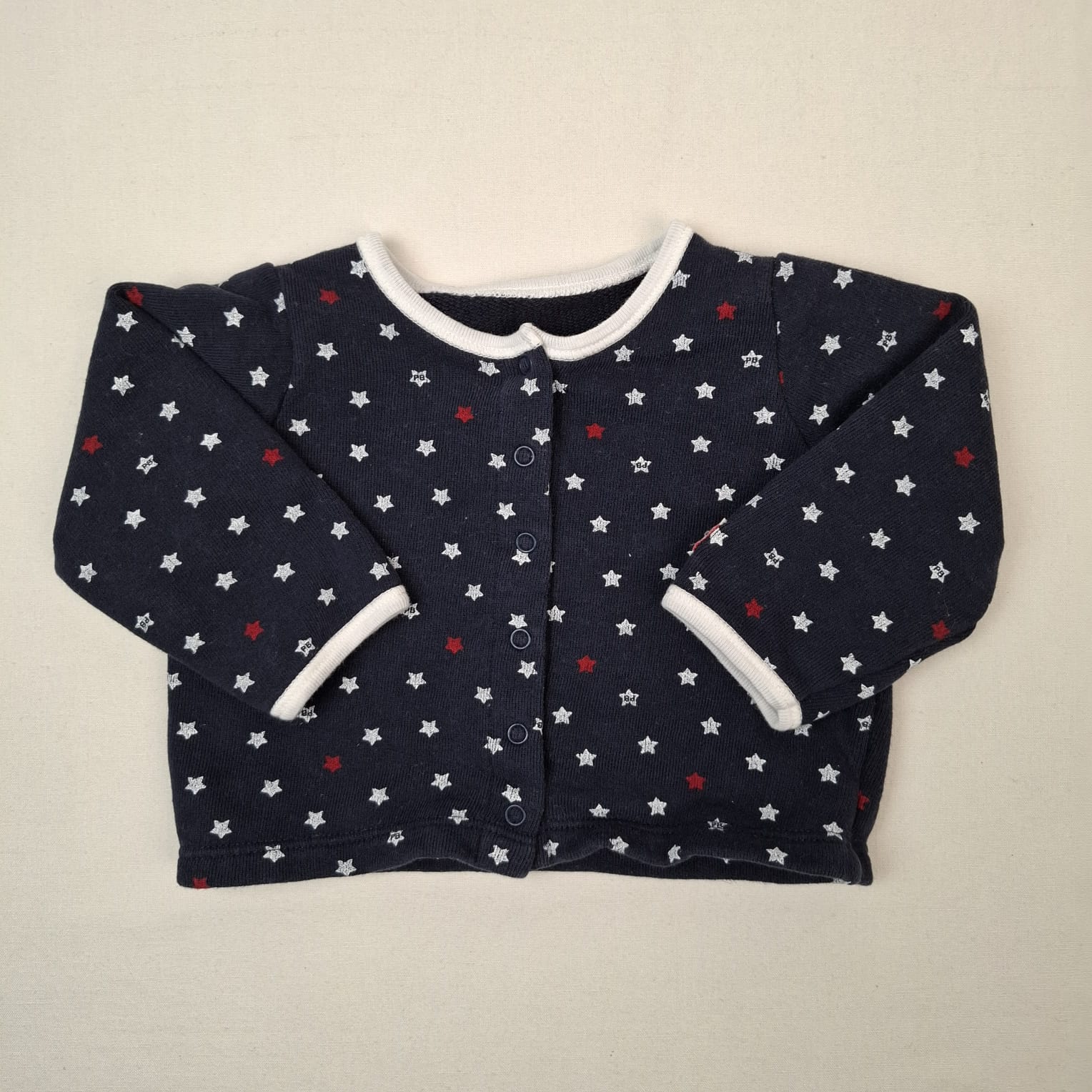 Autres commentaires : Cardigan bleu marine à col blanc, motifs étoiles floquées blanches et rouges, fermeture devant par boutons pression.