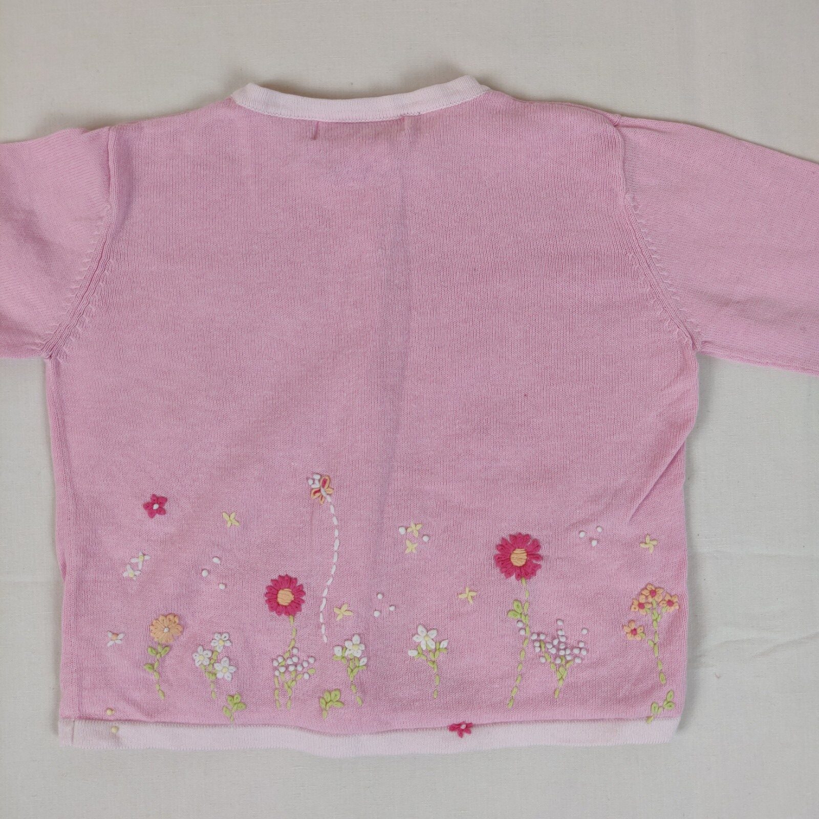 Autres commentaires : 45% coton. Gilet rose à motifs brodés floraux multicolores. Ouverture centrale à boutons classiques. Le col, les poignets et la taille sont de couleur rose pâle.