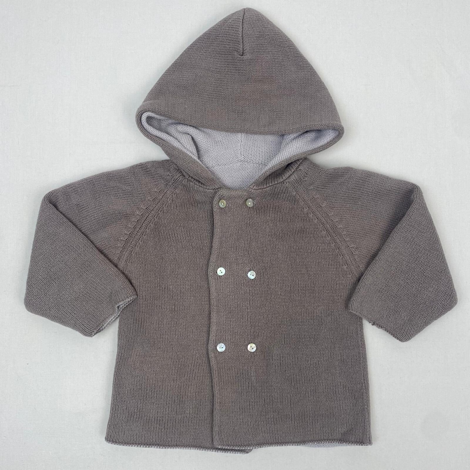 Autres commentaires : Gilet à capuche et manches longues en maille grise, intérieur bleu, fermeture devant par boutons.