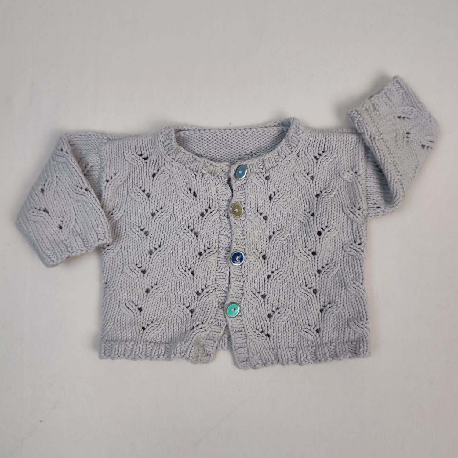 Autres commentaires : Cardigan en maille grise torsadée et légèrement ajourée, col rond, fermeture par boutons devant.