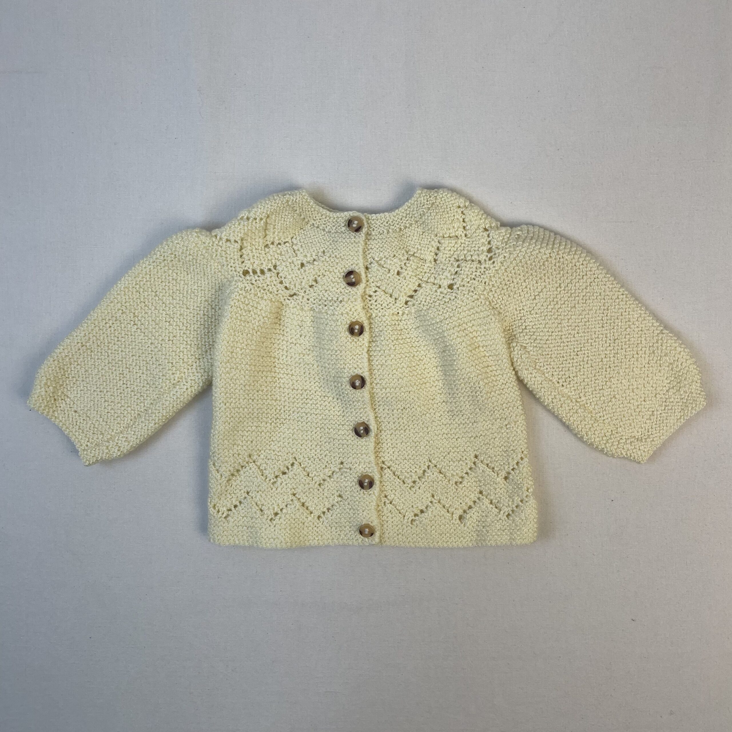 • Gilet tricoté jaune clair, mailles ajourées ou en point mousse, fermeture devant par petits boutons classiques. Taille estimée 6M.