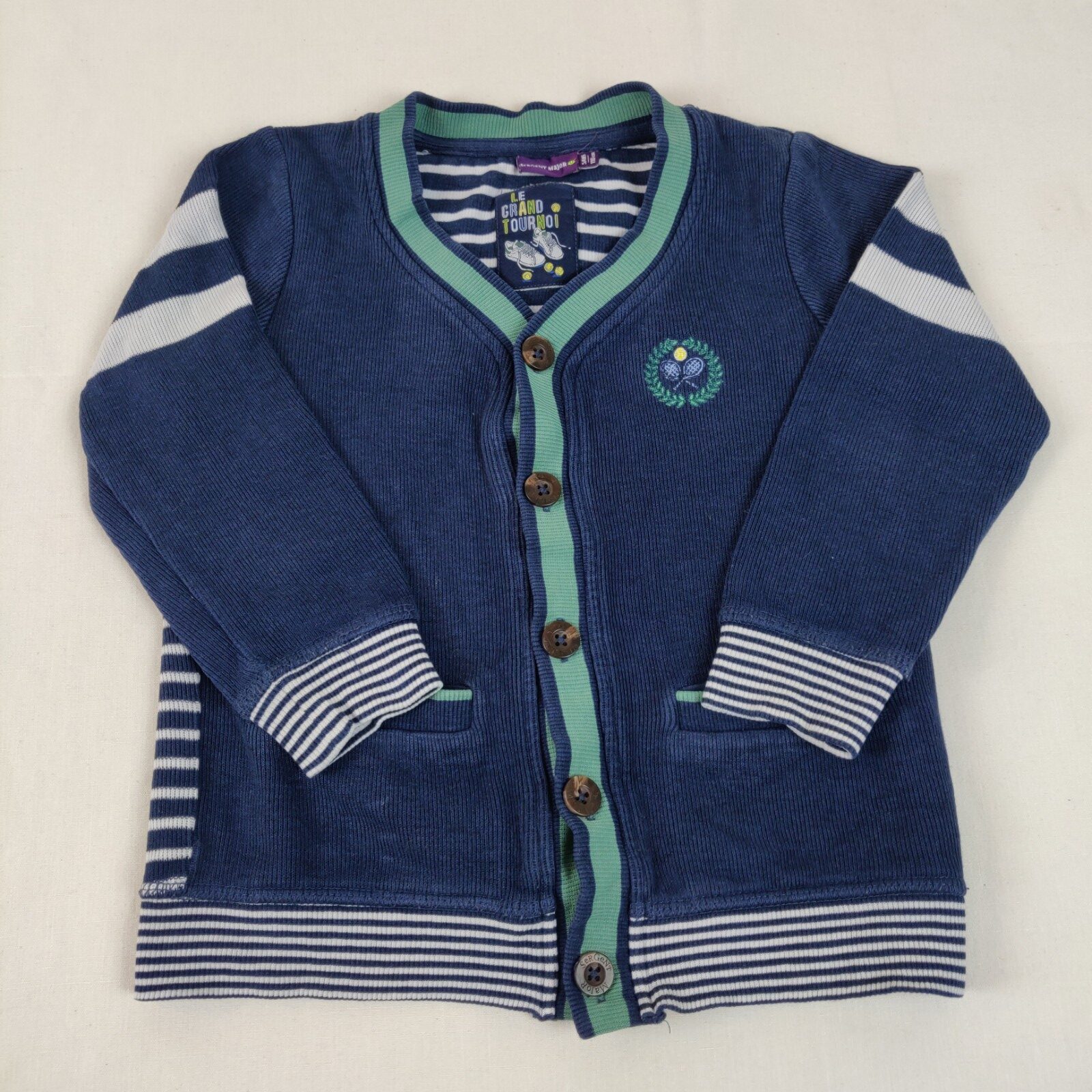 Autres commentaires : Gilet bleu marine avec des bandes blanches. Ouverture centrale réhaussée de couleur verte à boutons classiques (1 bouton supplémentaire fourni). Un motif central raquettes de tennis. 2 poches latérales.