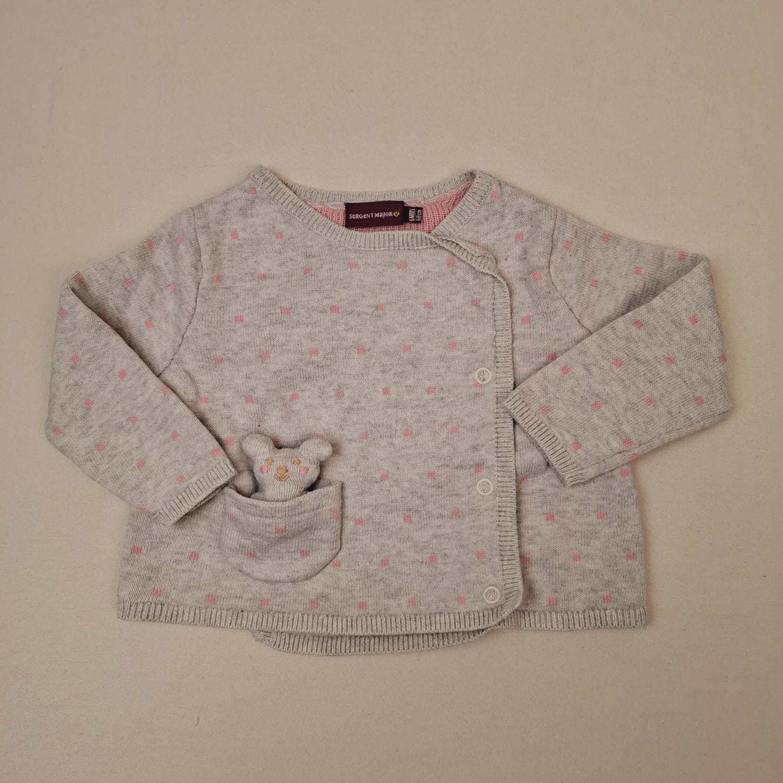 Autres commentaires : Gilet brassière en maille gris clair à pois rose, col rond et bordures côtelées, intérieur en maille rose à pois gris, fermeture croisée par boutons pression et par lanières roses à l’intérieur, devant petite poche avec une tête de mini ours gris ui dépasse, .