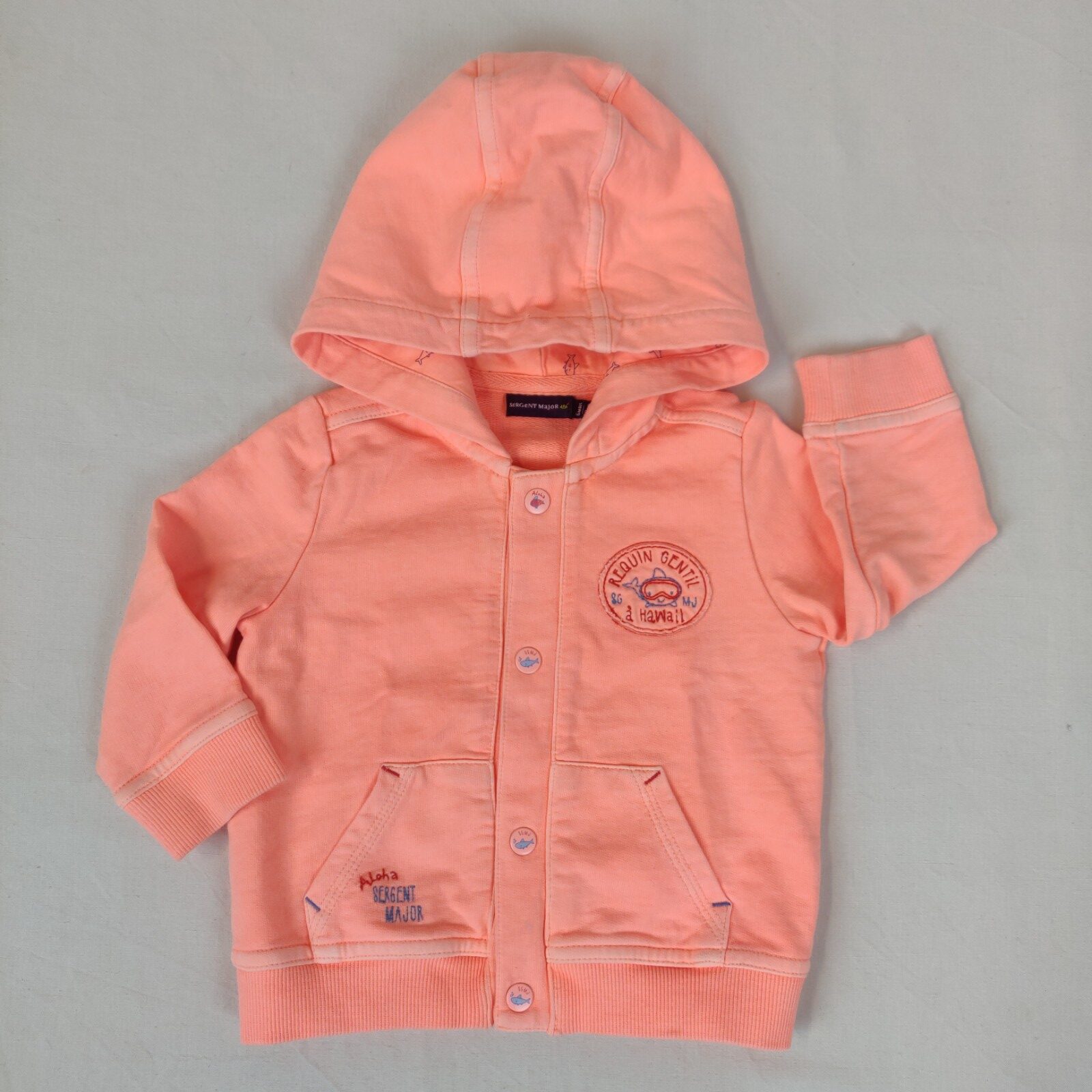 Autres commentaires : Gilet orange fluo manches longues avec capuche et une fermeture par boutons pression.Une légére tâche marron sur le bras.