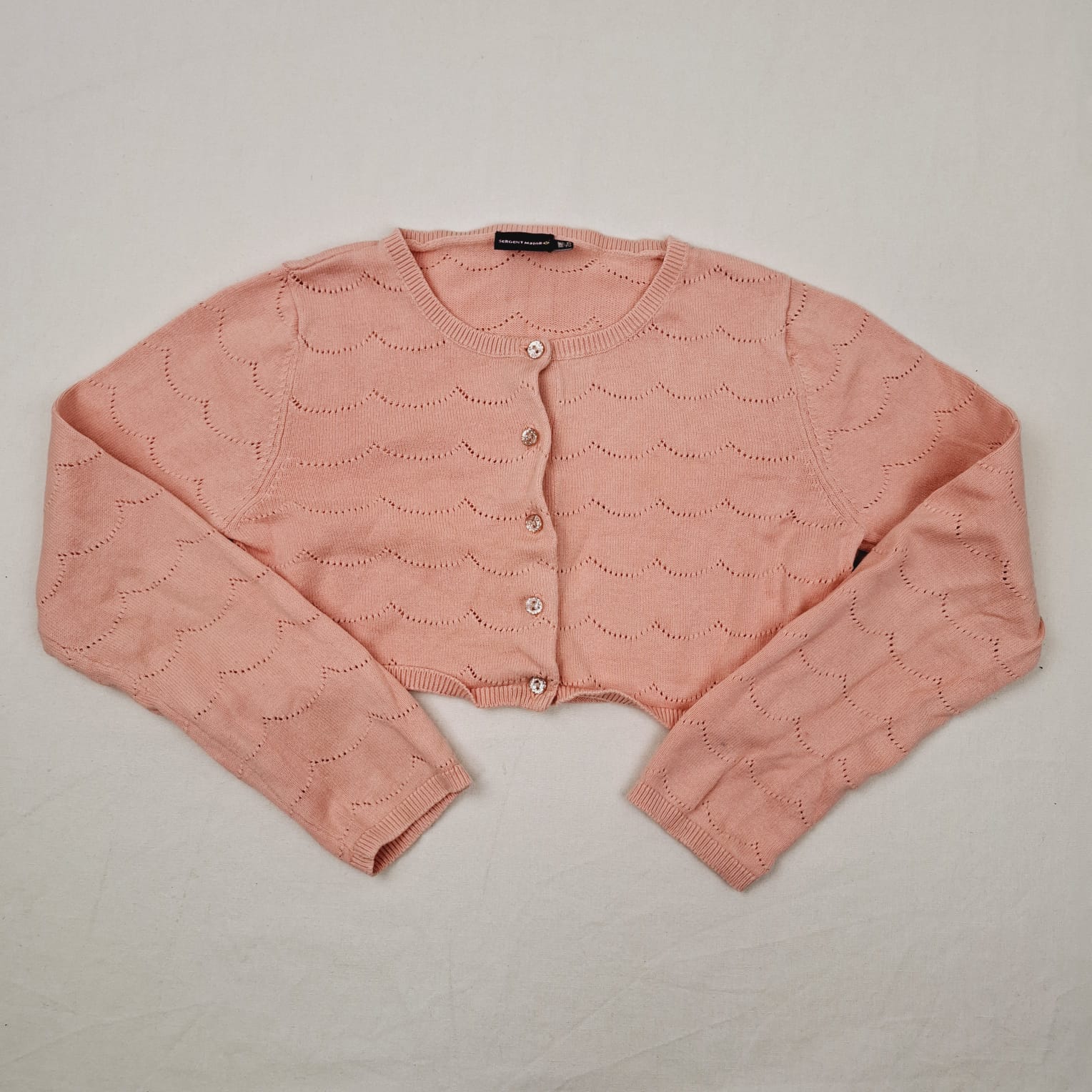 Autres commentaires : Cardigan en maille ajourée rose pâle, col rond, finition bord-côte au col, poignets et à la base, le petit empiècement en forme de cerf-volant et les boutons pailletés.