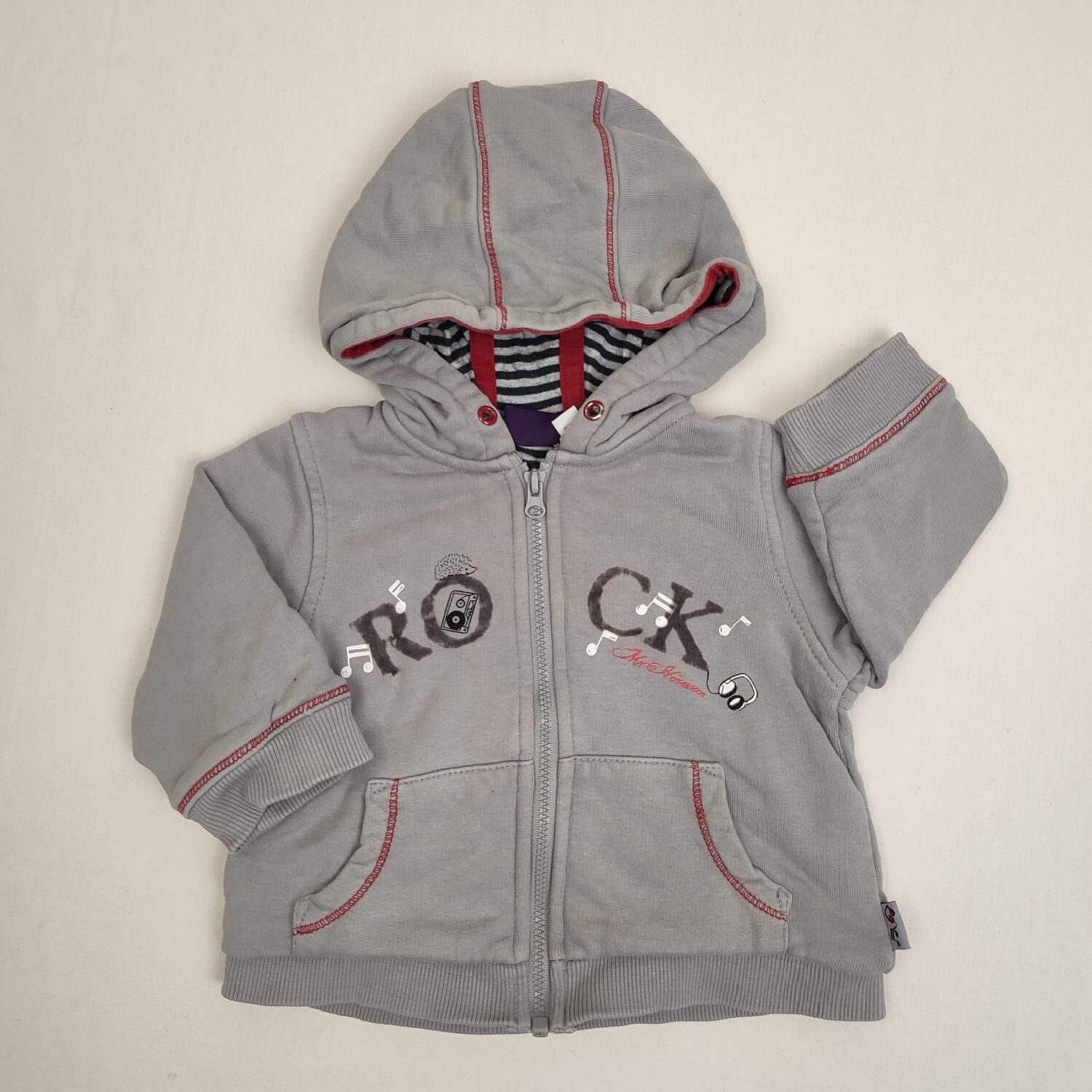 Autres commentaires : Gilet-sweat à capuche gris à manches longues, doublure à rayures bleu marine et grises en 100% coton, bordures élastiquées, motifs hérisson, notres de musique, casque et cassette audio avec inscriptions « ROCK » et « Mr Herisson », double poche ventrale, fermeture devant par zip.