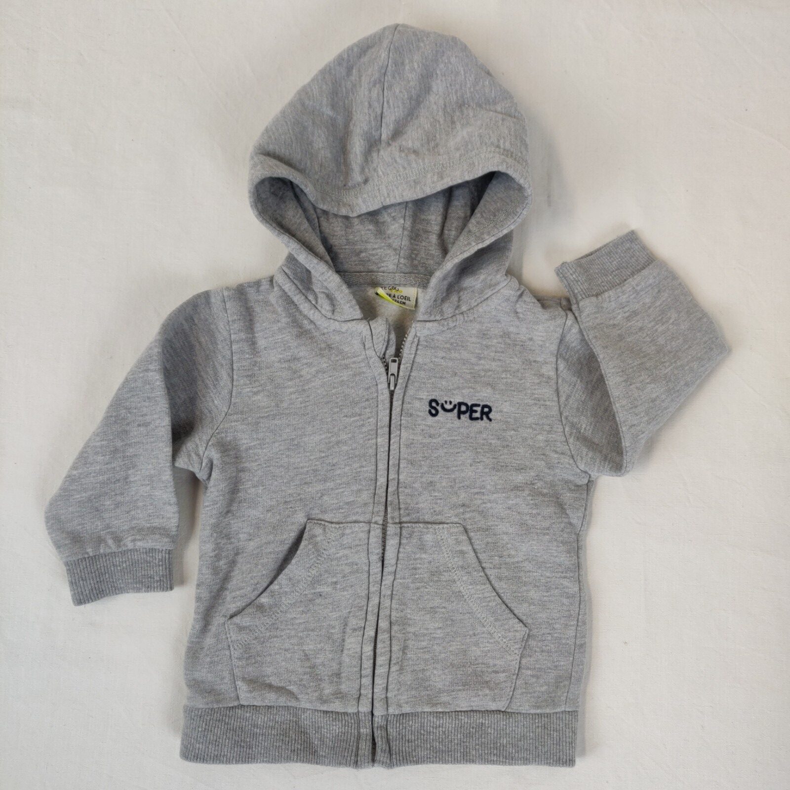 Autres commentaires : 22% polyester. Gilet à capuche – gris chiné. 2 poches latérales. Ouverture centrale zippée.