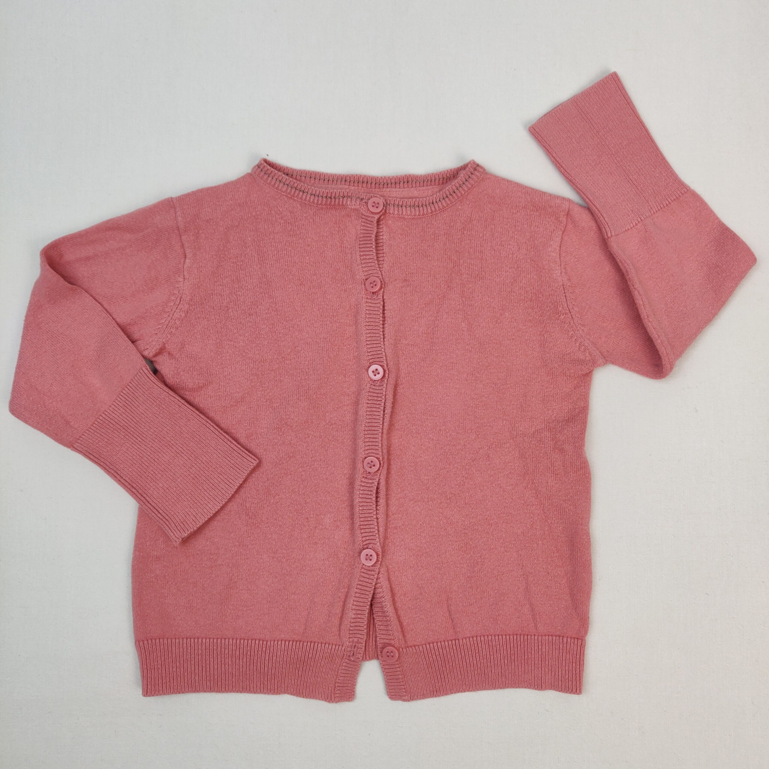 Autres commentaires : Gilet rose, col rond, bords côtelés et élastiqués, fermeture par boutons classiques.