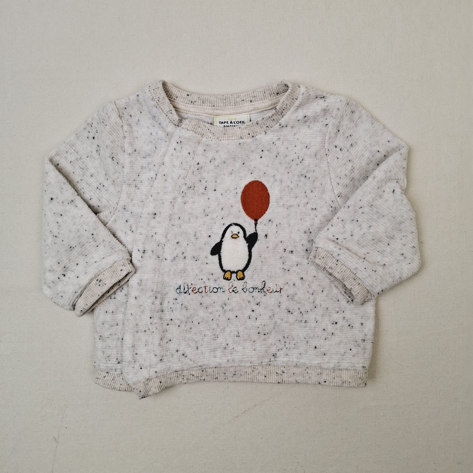 Autres commentaires : Gilet en velours côtelé gris, motif le pingouin et inscription « Direction le bonheur », col rond, fermeture par boutons pression devant droit, finition bord-côte autour de le col, à la base et en bas de manche.