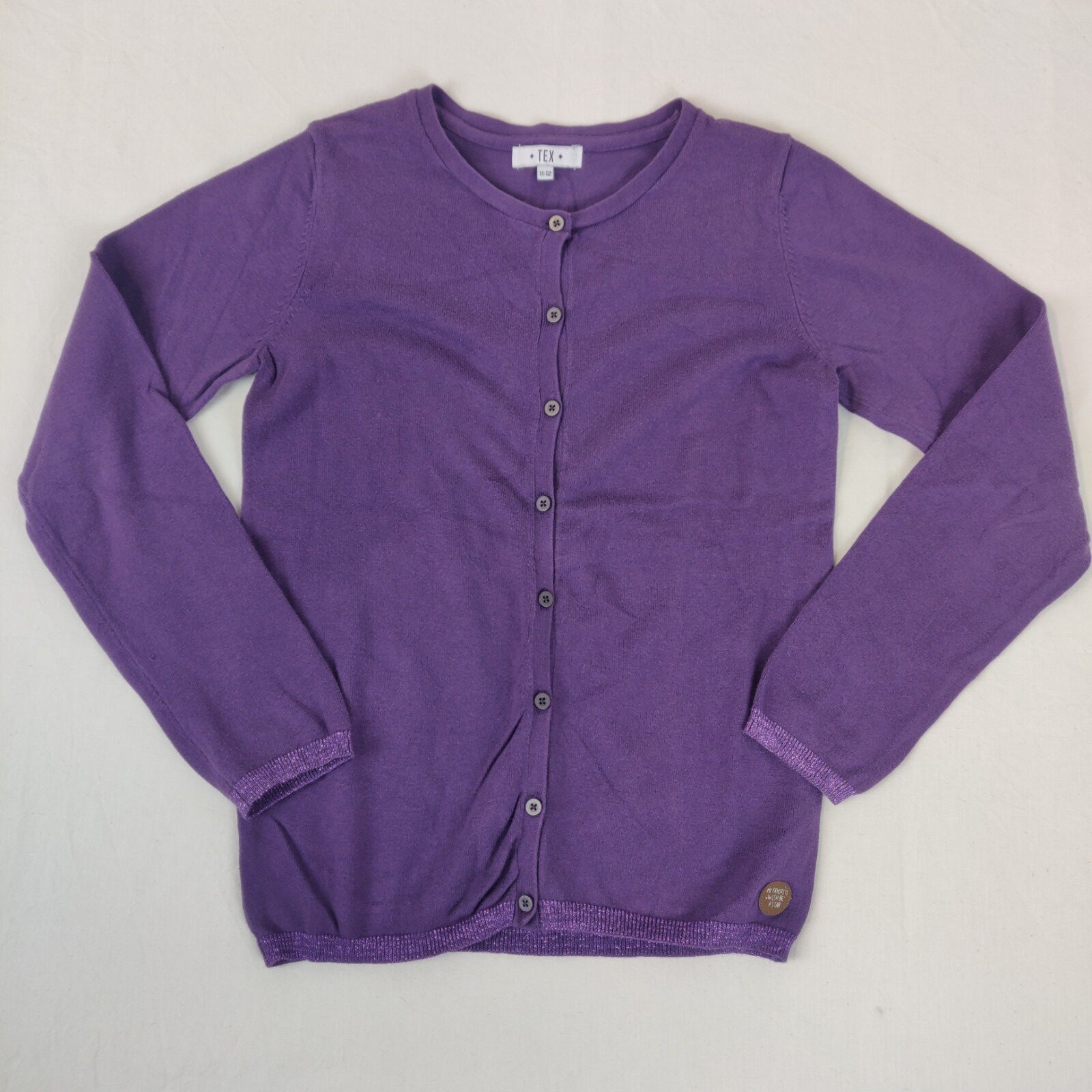 Autres commentaires : 20% polyamide. Gilet en fines mailles – violet. Poignets et taille façon tricot élastique violet pailleté. Ouverture centrale à boutons.