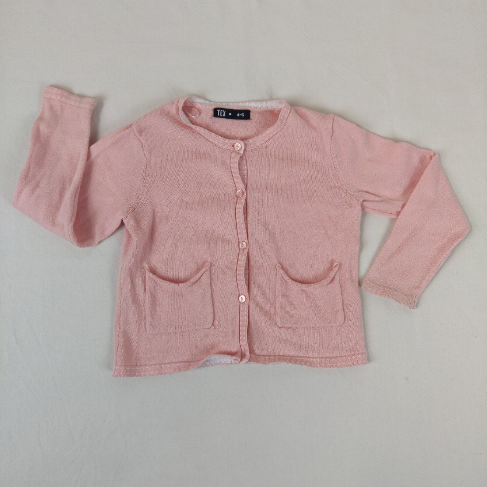 Autres commentaires : Gilet à maille fine rose, col rond et boutons.