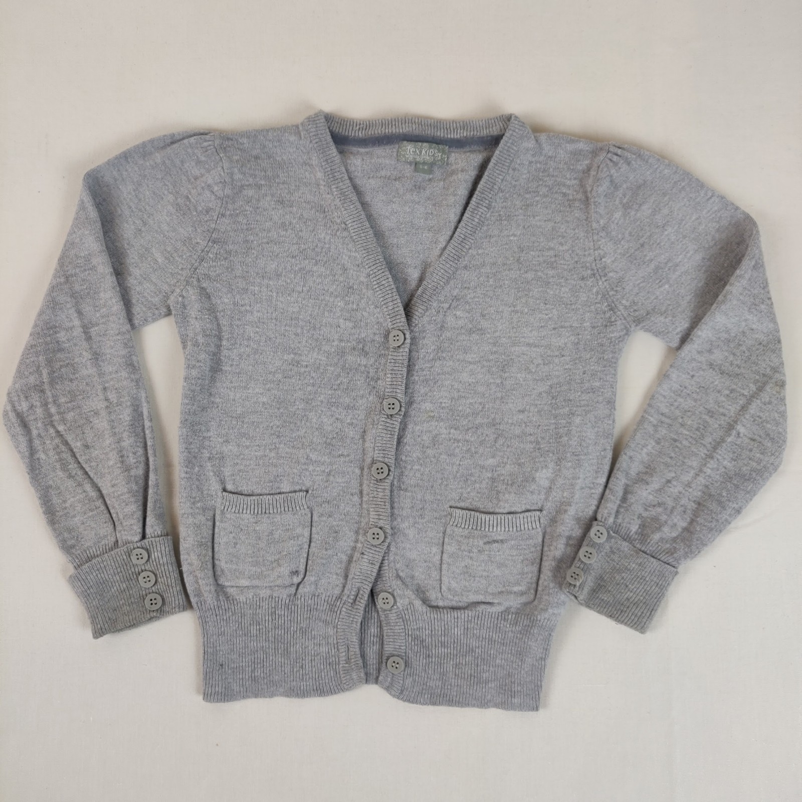 Autres commentaires : 20% viscose, 20% polyamide. Gilet en fines mailles – gris chiné. Col V. Ouverture centrale classique à boutons. 2 poches latérales. Manches retroussées avec 3 boutons décoratifs. Très léger effet pelucheux.