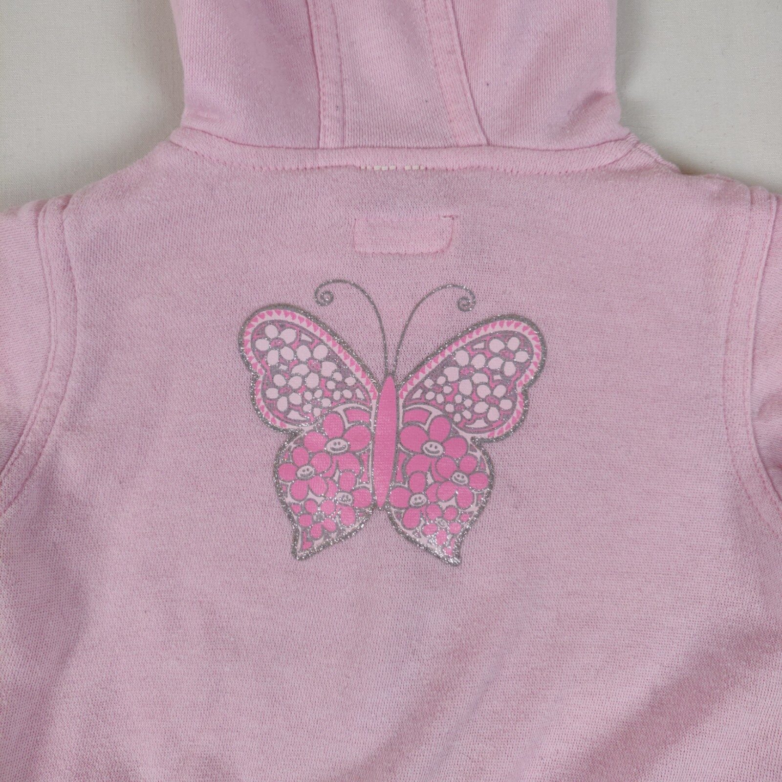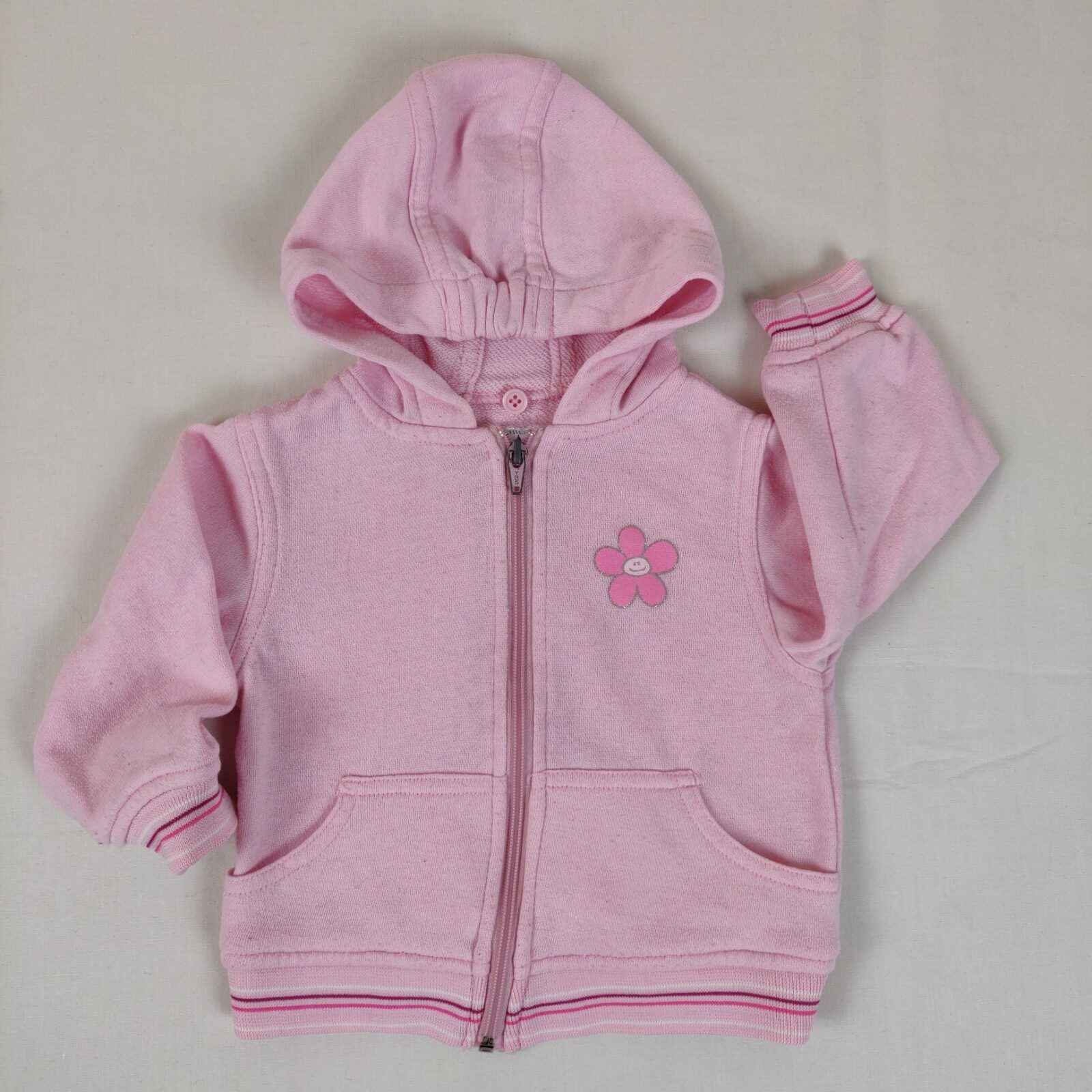 Autres commentaires : 40% polyester. Gilet à capuche – rose avec motif central fleur souriante rose et argentée. Motif papillon rose et argenté central au dos. Ouverture centrale à fermeture éclair. 2 poches latérales. Manches et taille façon tricot élastique rose avec de fines rayures blanches, prunes et roses. Effet légèrement pelucheux.