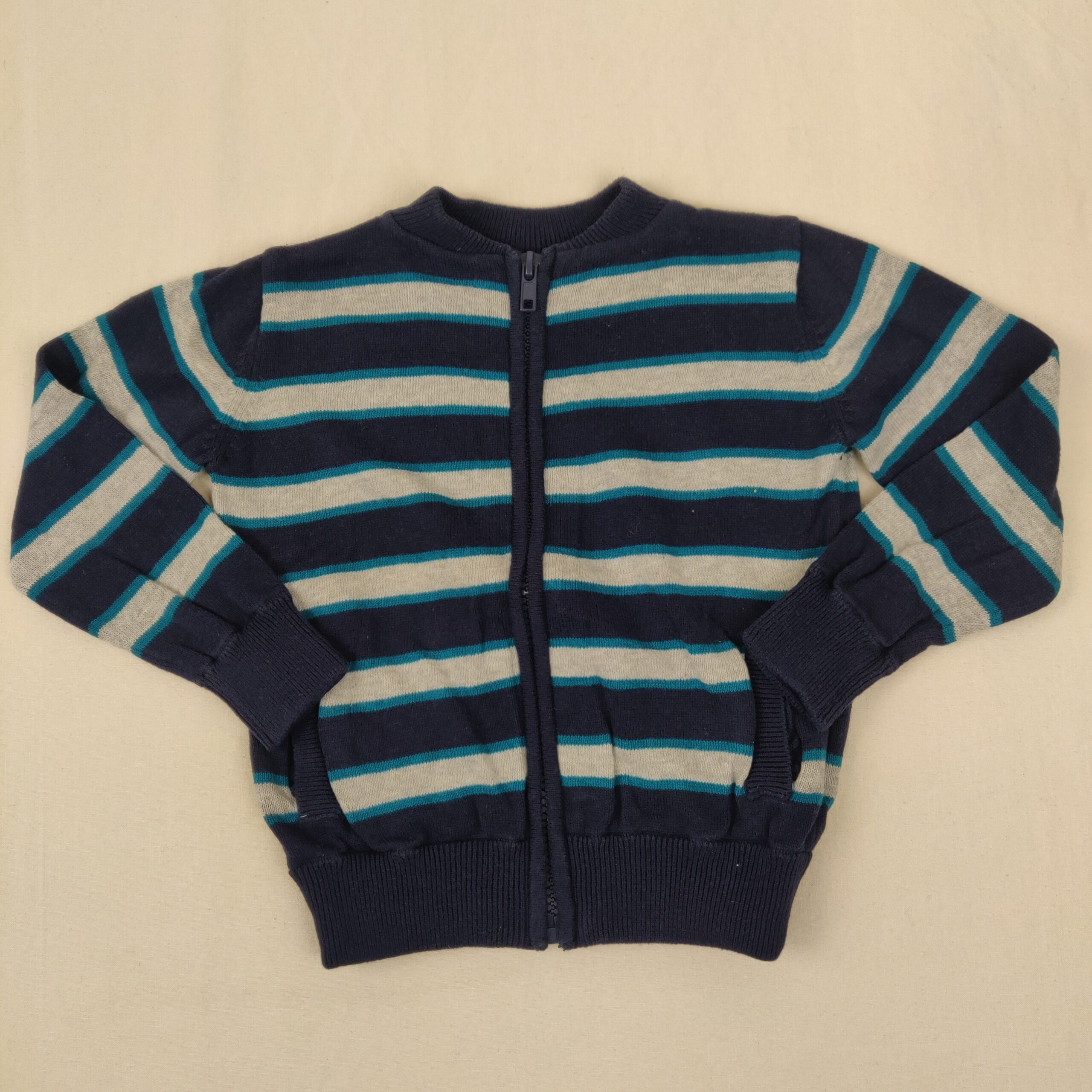 Autres commentaires : Gilet en maille zippé, à bandes bleu marine, bleues et grises.