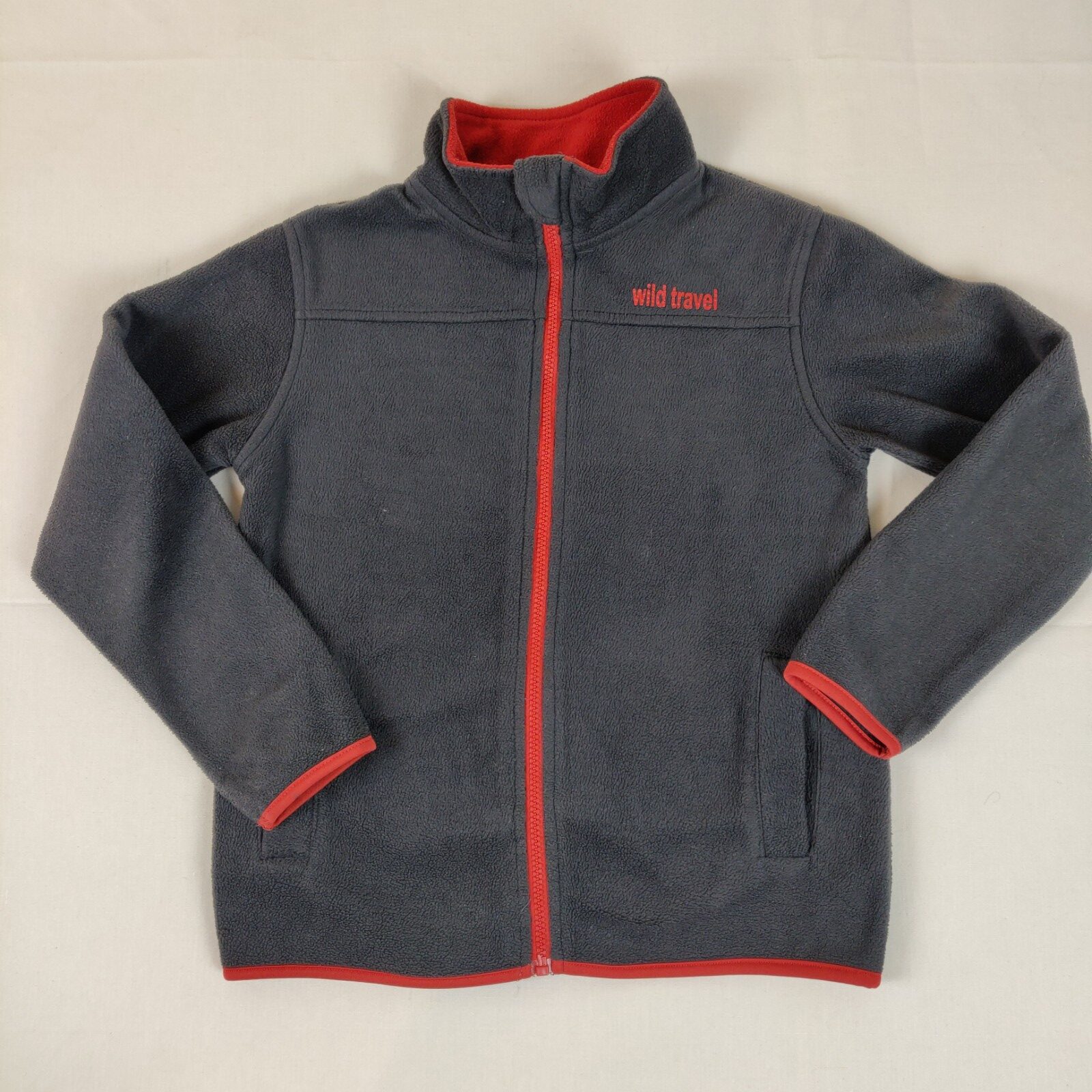 Autres commentaires : Gilet en polaire – gris avec col légèrement montant. Ouverture centrale à fermeture éclair orange. Inscription centrale orange « Wild travel ». 2 poches latérales. Motif central au dos discret montagnes et inscription « Mountain ». Usure normale du vêtement.