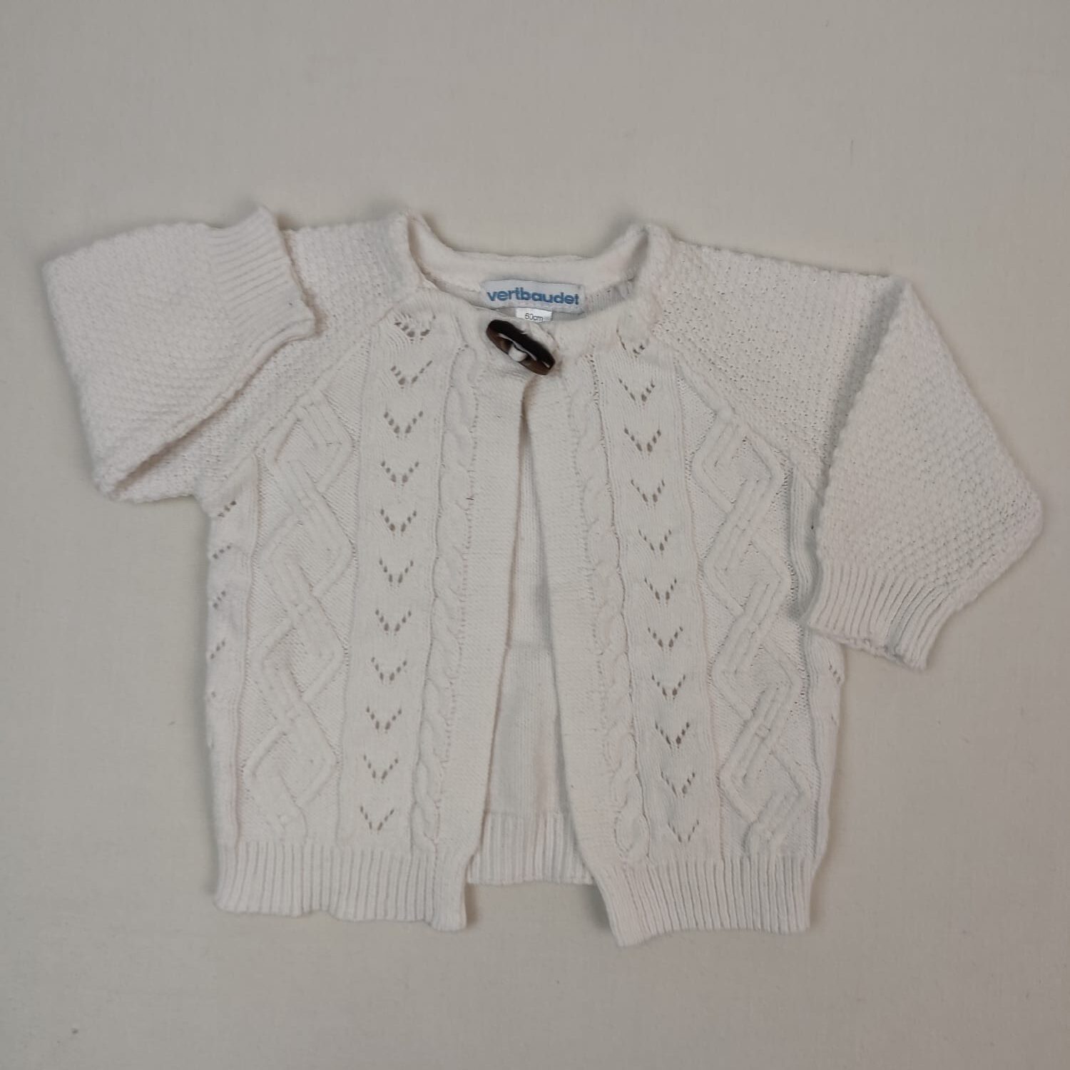 Autres commentaires : 31% Polyester, Gilet manches longues blanc, en maille ajourée, torsadée sur le devant, col rond, fermeture en haut par un bouton unique style brandebourg.
