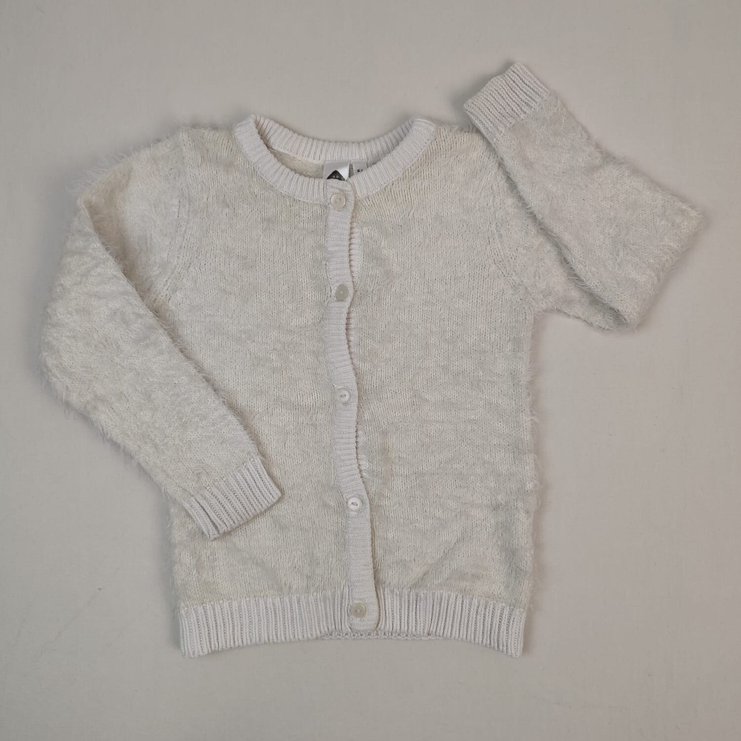 Autres commentaires : 33% acrylique. Cardigan en maille blanche à poils, fermeture par boutons devant.