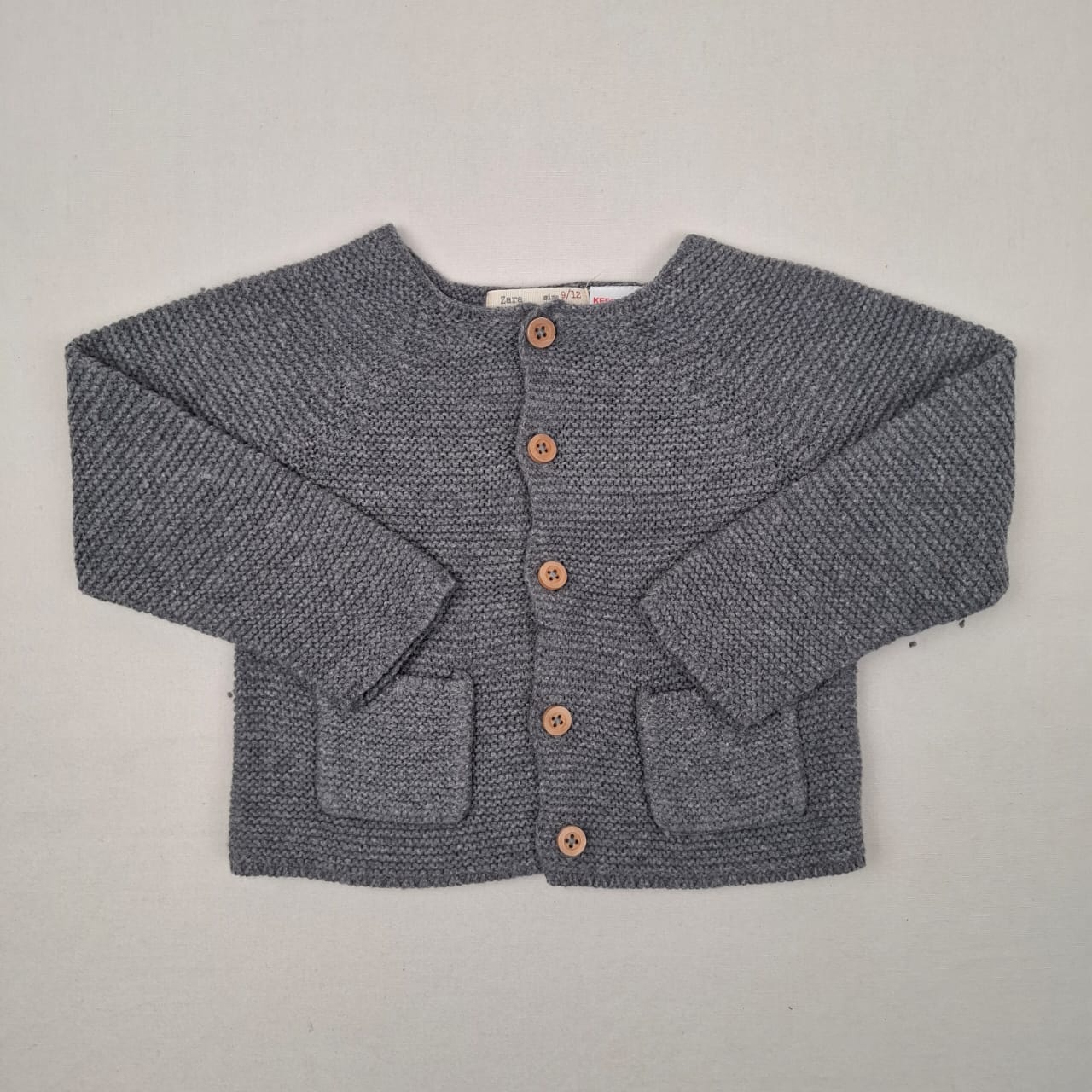 Autres commentaires : Gilet gris, Zara mini, 12 mois, fermeture avec boutons à l’avant avec deux poches, 32% polyamide, 27% laine.