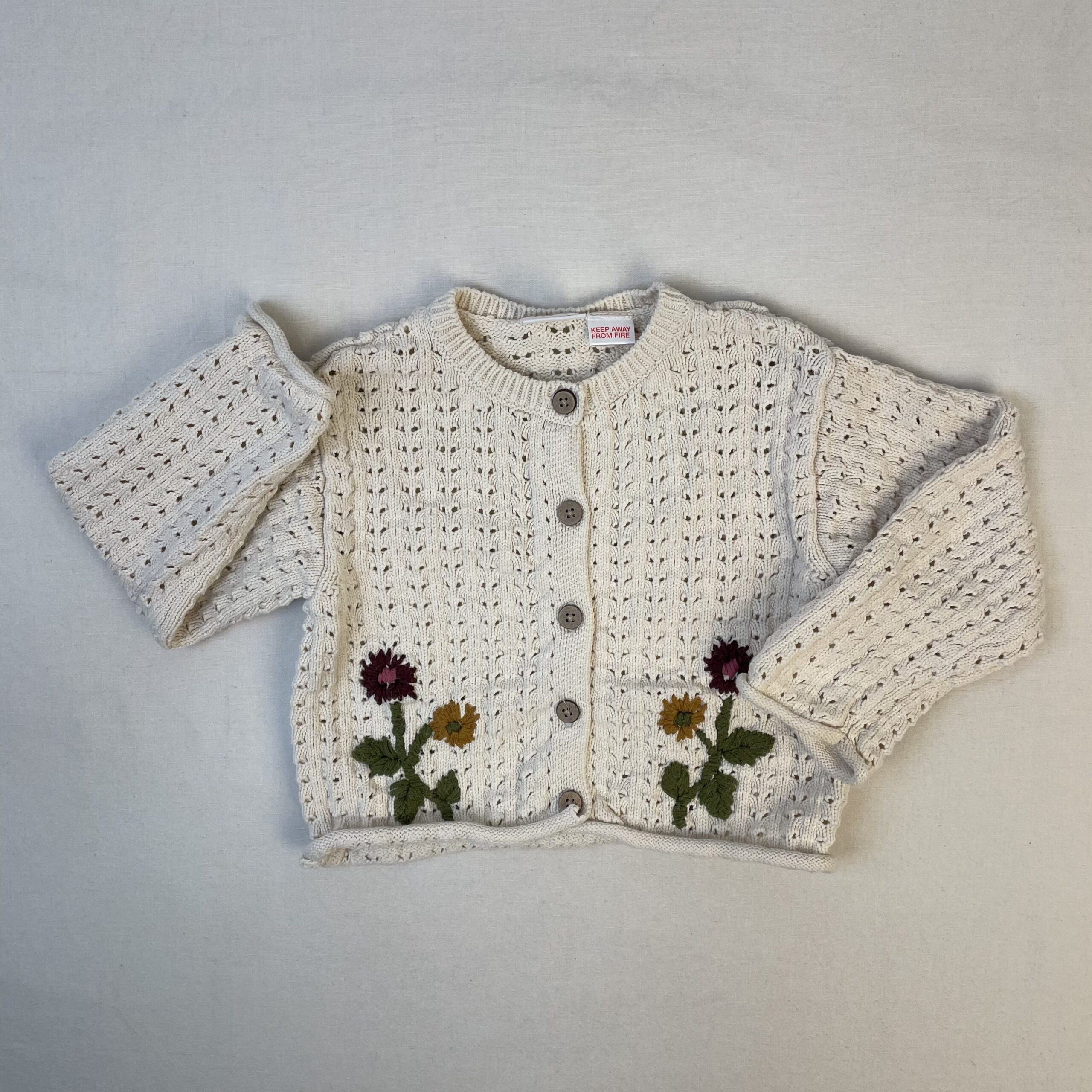 - Gilet cardigan écru en mailles ajourées, devant motifs fleurs brodées au fil de laine, fermeture devant par boutons classiques.