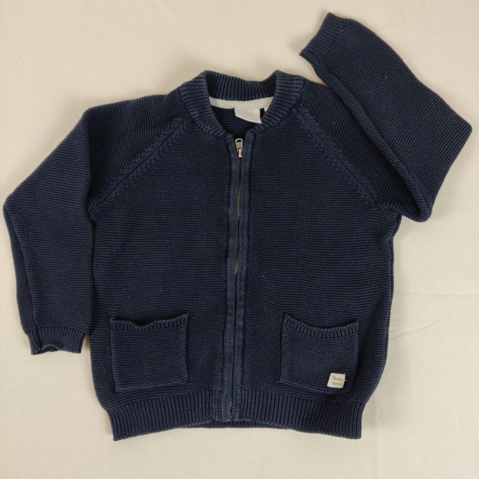 Autres commentaires : Gilet en fines mailles – bleu marine. Ouverture centrale zippée. 2 poches latérales dont celle de gauche ornée d’un écusson blanc avec l’inscription « Baby knit ». Légères marques d’usure près du zip.