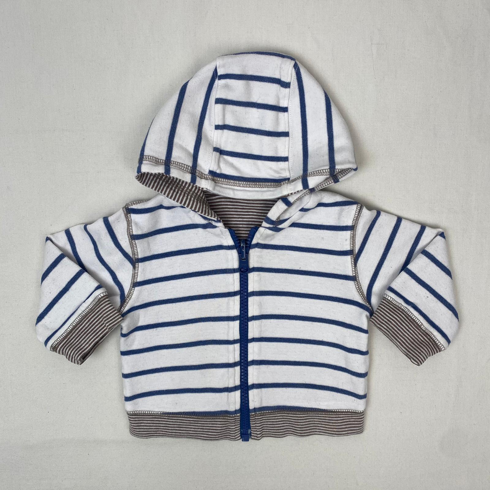 Autres commentaires : Gilet réversible à capuche, un côté blanc à rayures bleues et l’autre côté à rayures marron et blanches , fermeture devant par zip.