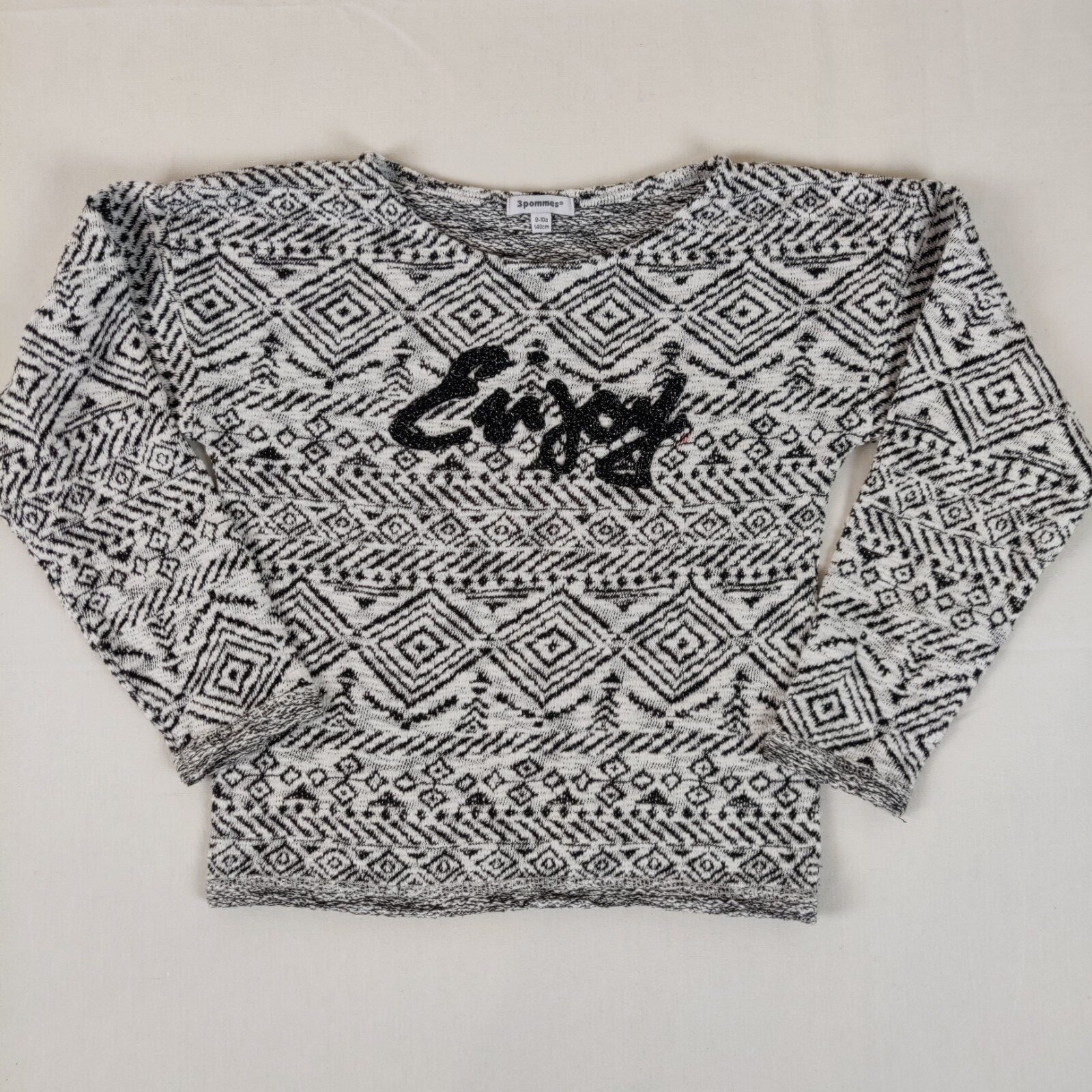 Autres commentaires : 25% polyester. Pull en fines mailles – blanc avec des motifs géométriques noirs. Inscription centrale piquée noire et argentée « Enjoy ». Petite tâche d’encre rouge vers le Y. Niveau réduit de fraise à myrtille.