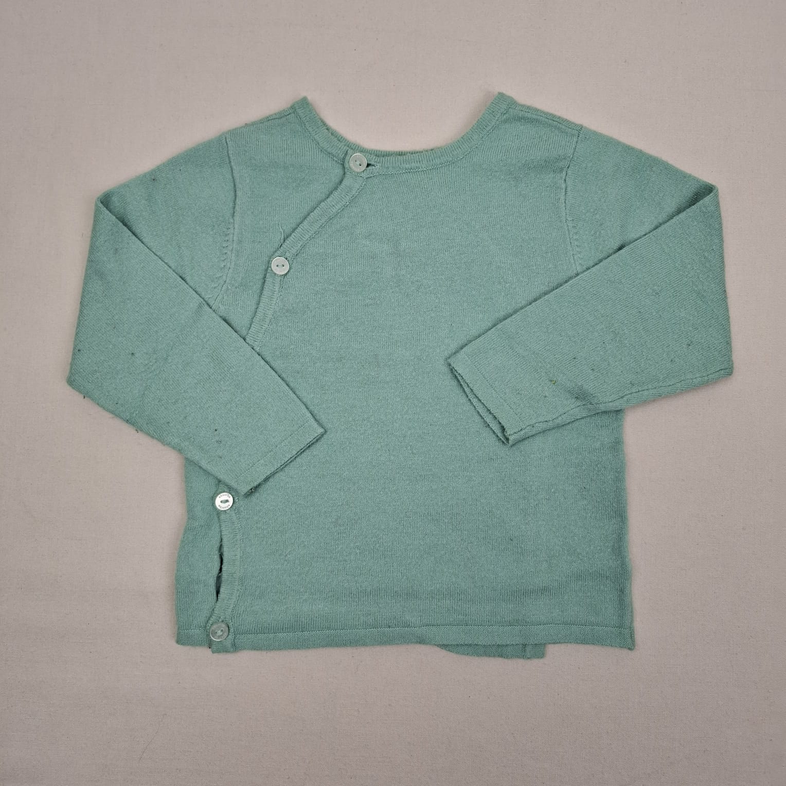 Autres commentaires : Pull léger turquoise, absoba, 12 mois, une pomme est brodé à l’avant du vêteme, boutons à l’arrière du pull pour ouvrir celui-ci.