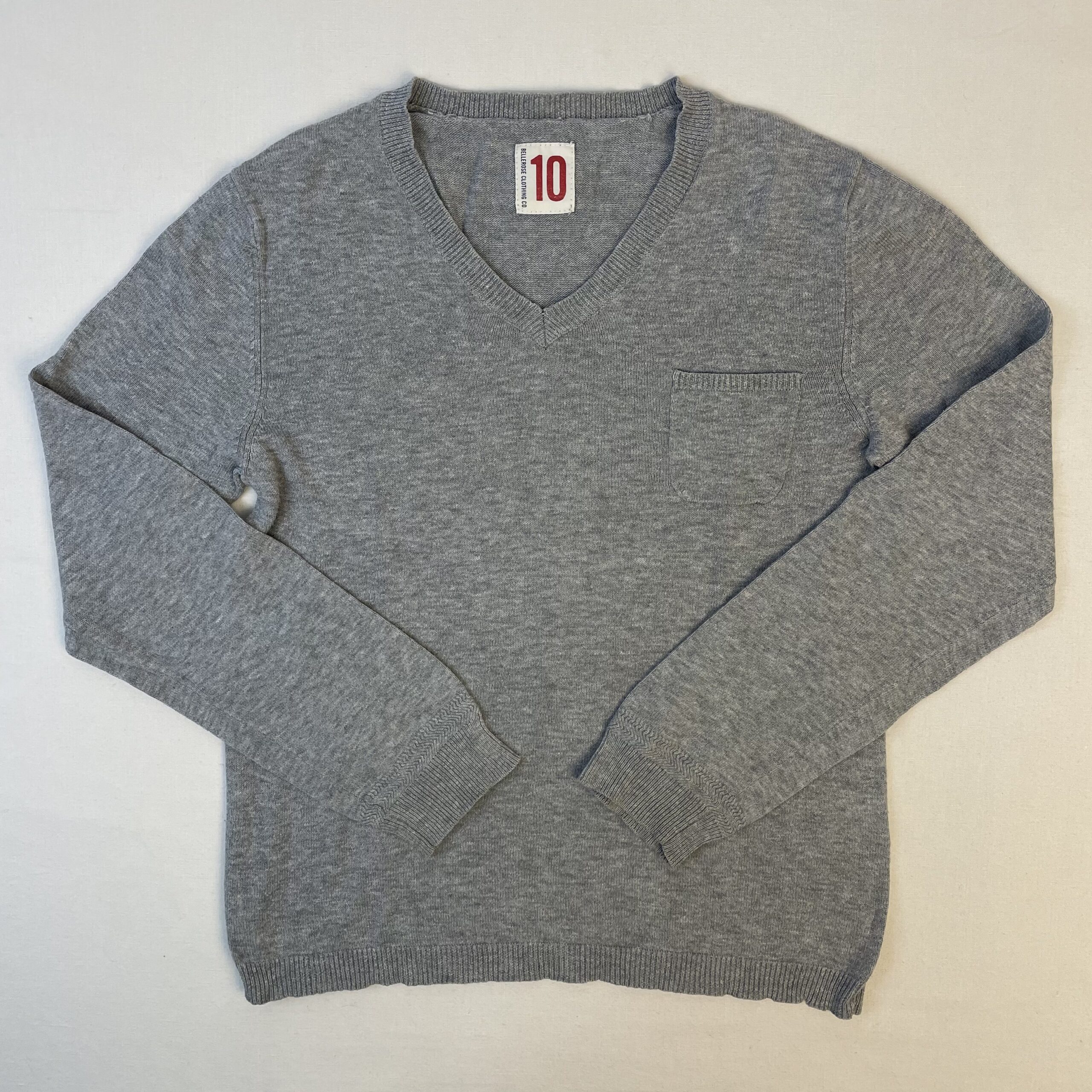 - Pull gris fin col en V. Un peu de fines peluches de frottement par endroit. Niveau réduit de Melon à Banane.