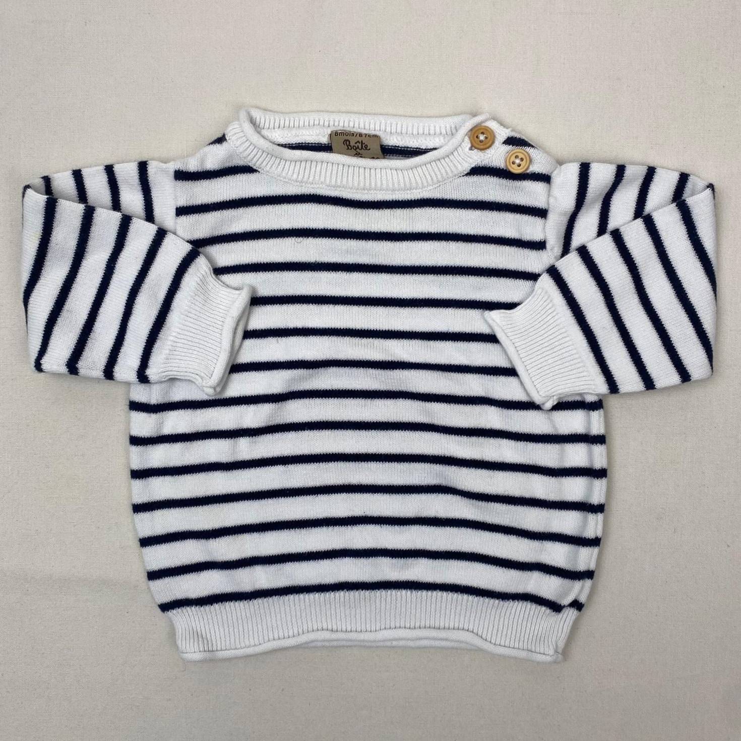 Autres commentaires : Pull marin blanc avec des rayures noires, fermeture par boutons à l’épaule gauche.