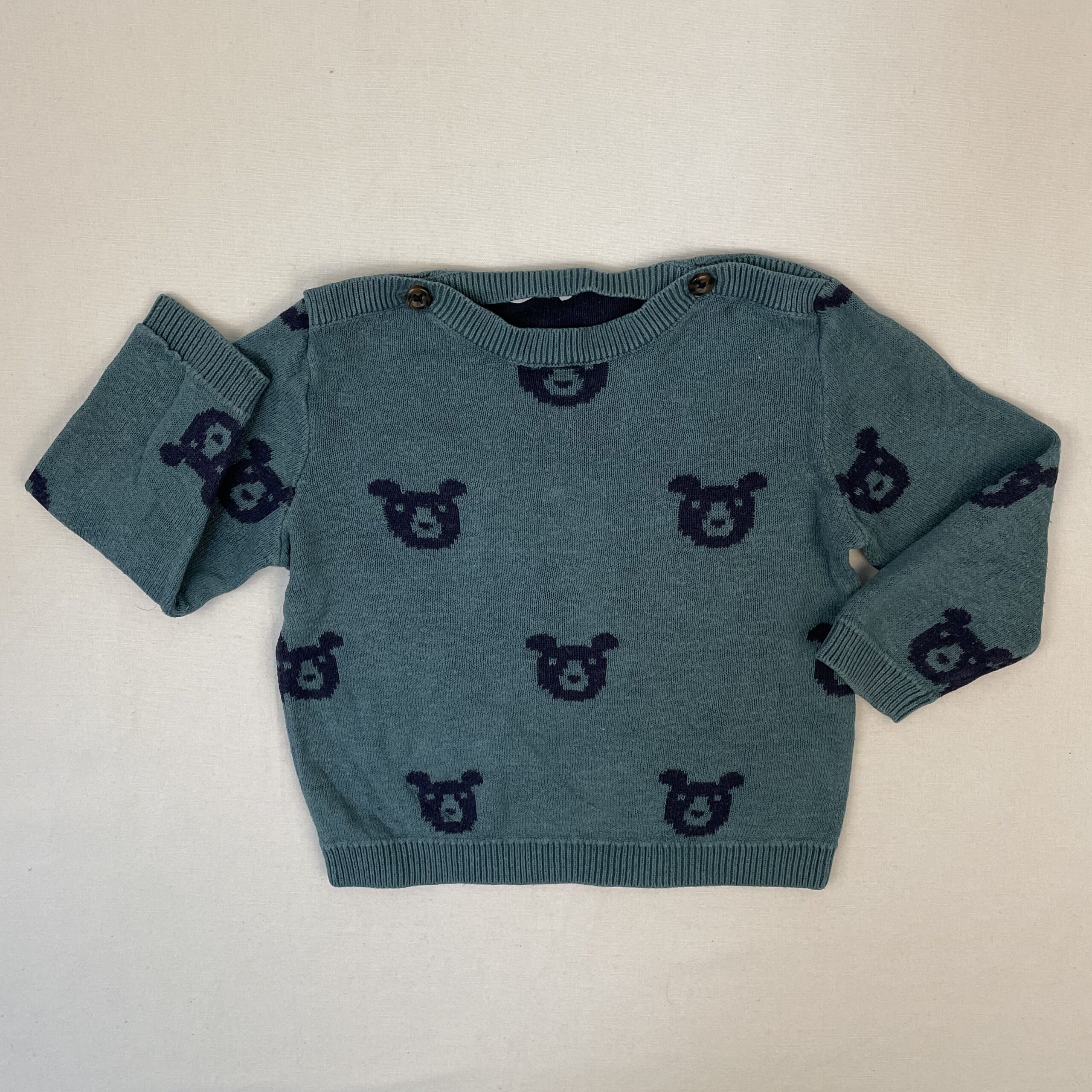 - Pull en tricot vert sapin, parsemé de tête d’ours bleu marine, fermeture du col par petit bouton. Niveau réduit de Fraise à Myrtille car quelques fines peluches sur le pull.