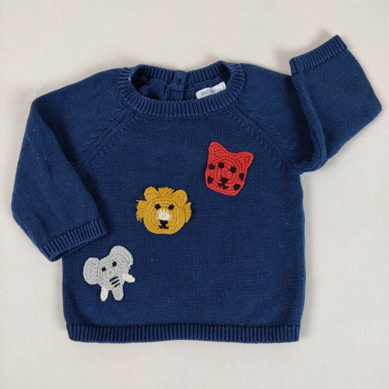 Autres commentaires : Pull en tricot bleu canard, motif têtes d’éléphant gris, de lion camel et de renard roux brodées sur l’avant. Fermeture par 3 boutons au dos, à hauteur du cou.