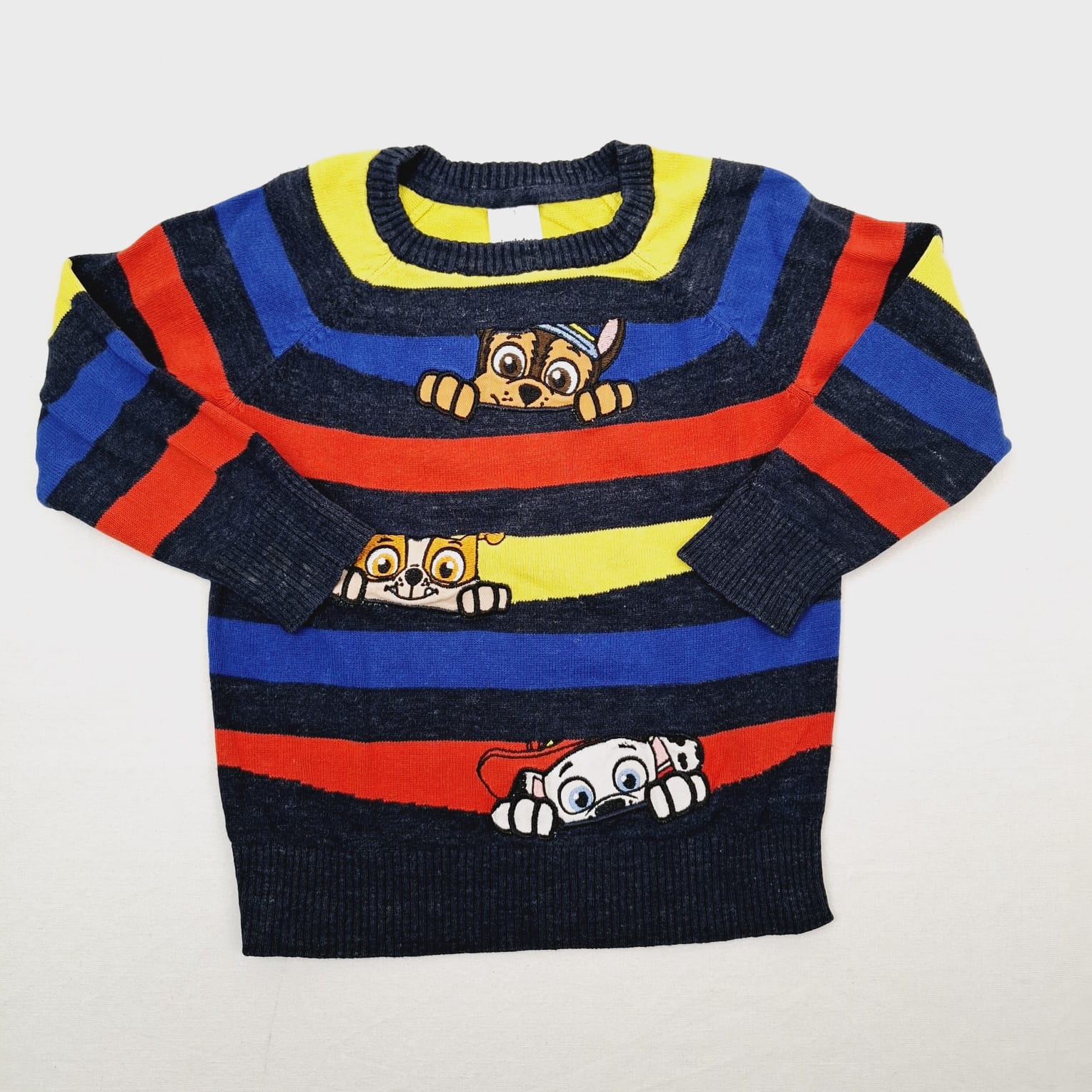 Autres commentaires : Pull bleu foncé, avec col rond, motif pat’patrouille.