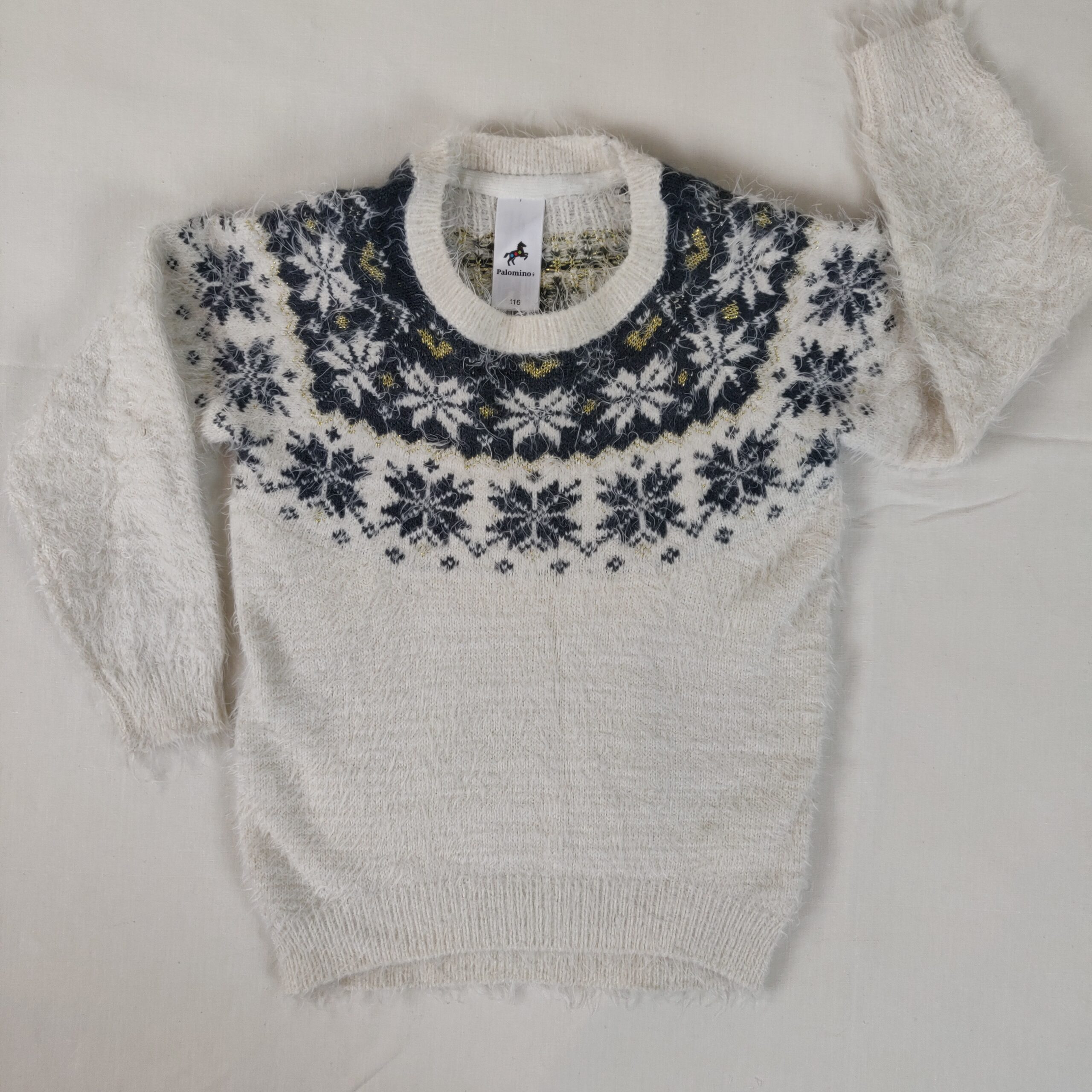 Autres commentaires : Pull d’hiver blanc, col rond, avec motif flocons d’hiver gris à l’encolure avec des touches dorées.
