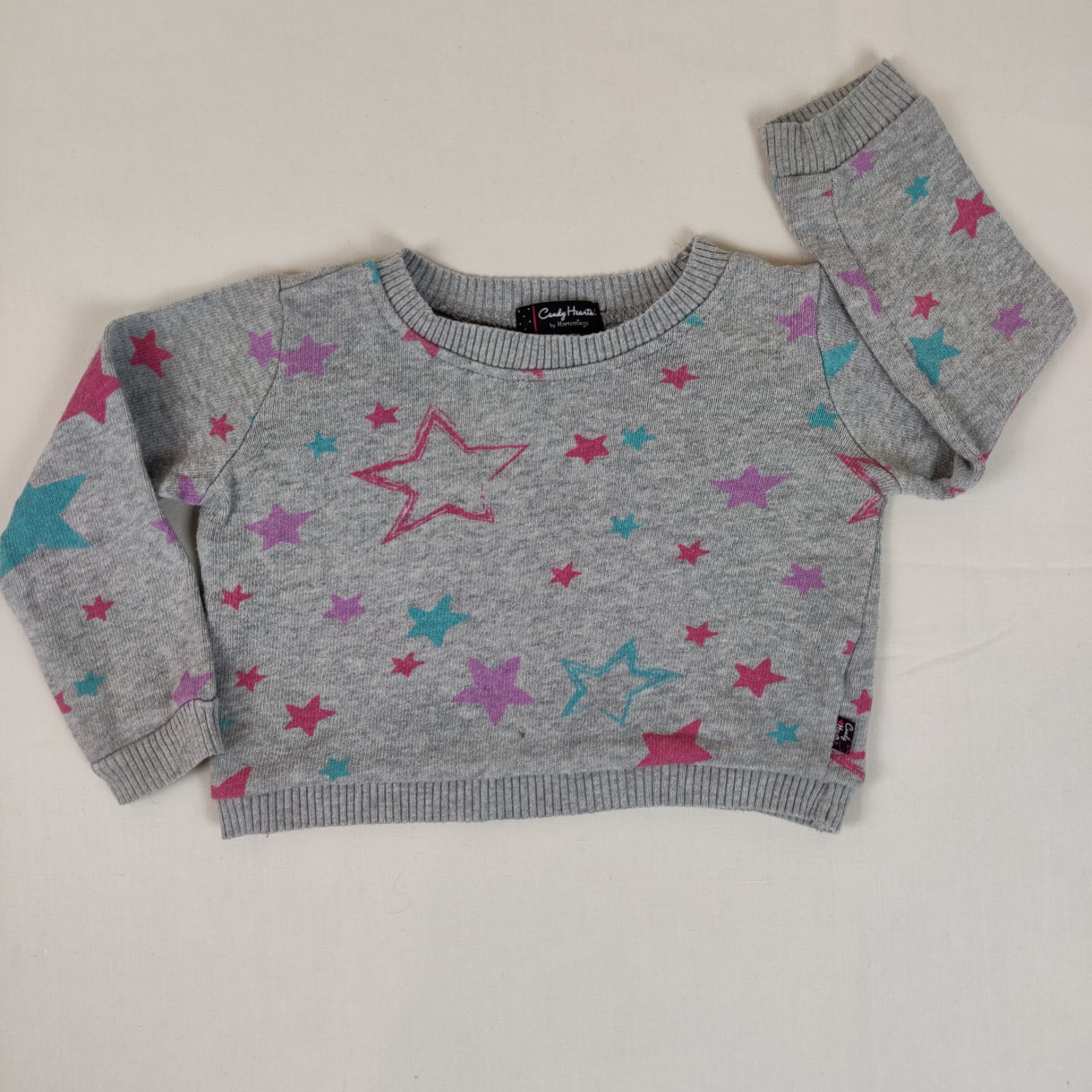 Autres commentaires : 40% acrylique. Pull en fines mailles – gris chiné avec motifs roses, violets, bleus étoiles. Très discrète tâche à la taille avant du pull.