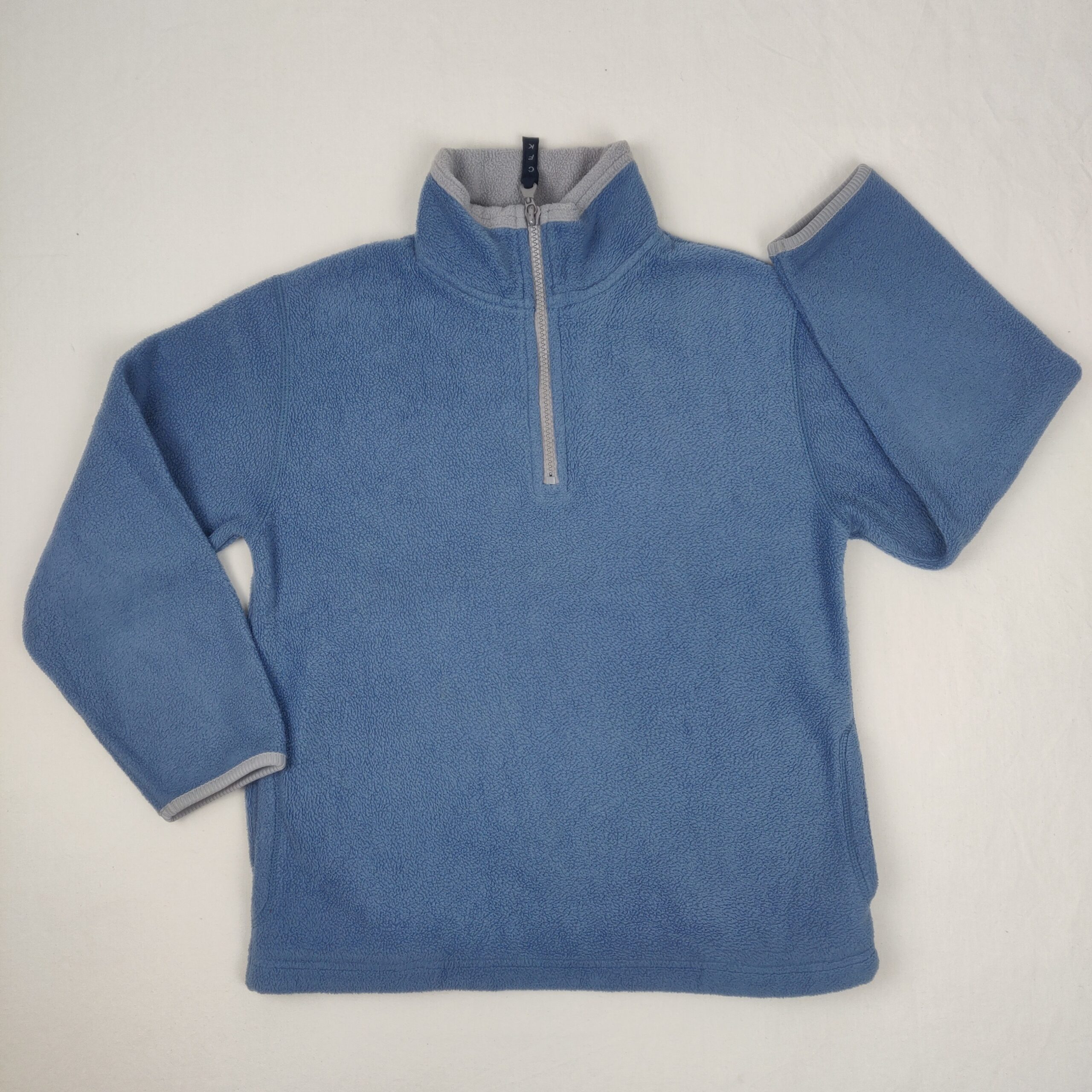 Autres commentaires : Pull polaire de couleur bleu glacier, col cheminée, fermeture zippée au col devant, zip et bord du col gris, poches sur les côtés.