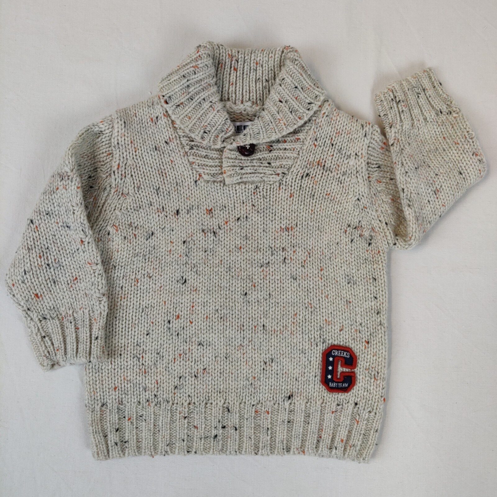 Autres commentaires : Pull col châle beige à petits fils oranges et bleu marine. Pas d’étiquette mais probablement coton/polyester.