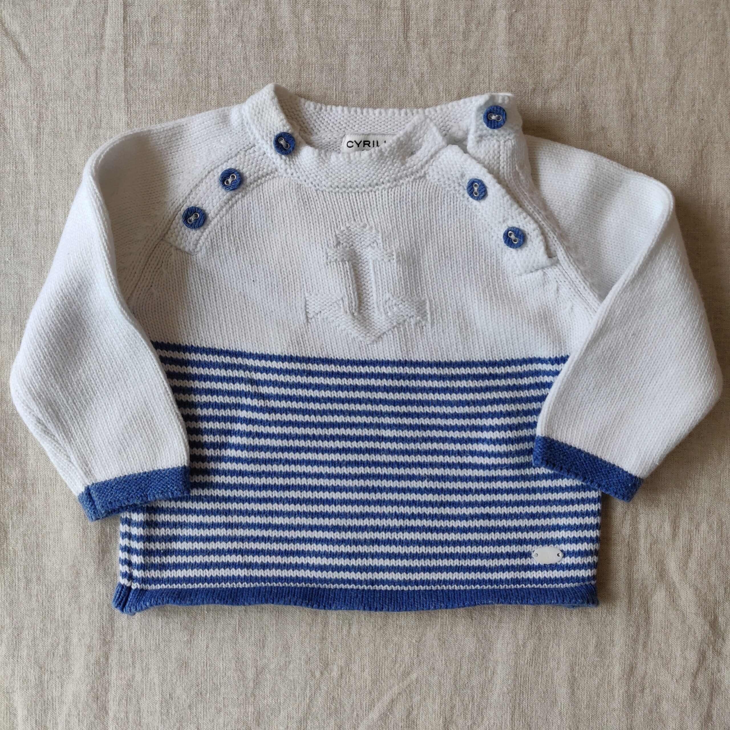 Autres commentaires : Pull de type marinière bleu et blanc avec fermeture 3 boutons sur l’épaule gauche – ancre dans la maille en relief sur le devant