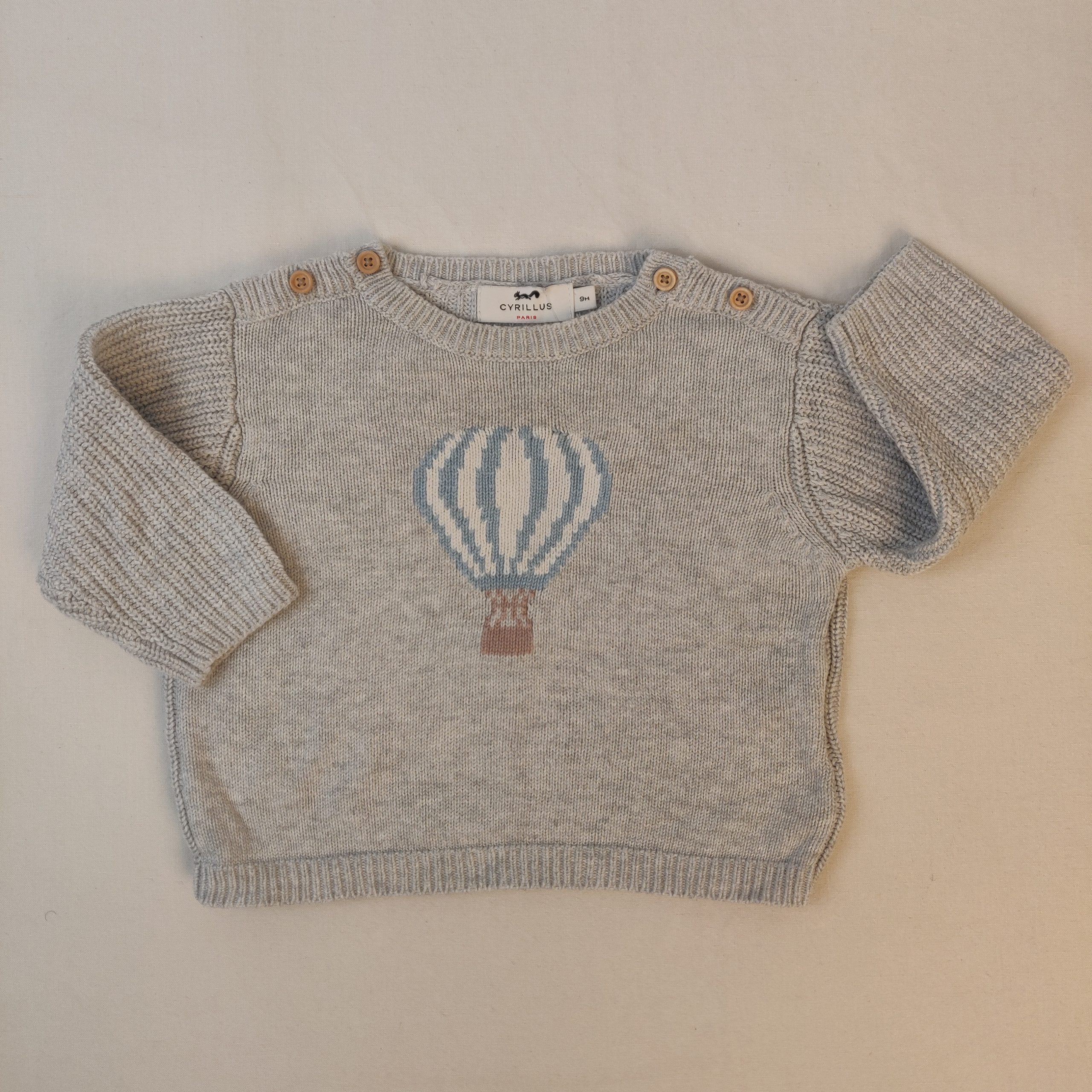 - Pull en coton gris clair, devant motif montgolfière, fermeture aux épaules par petits boutons.