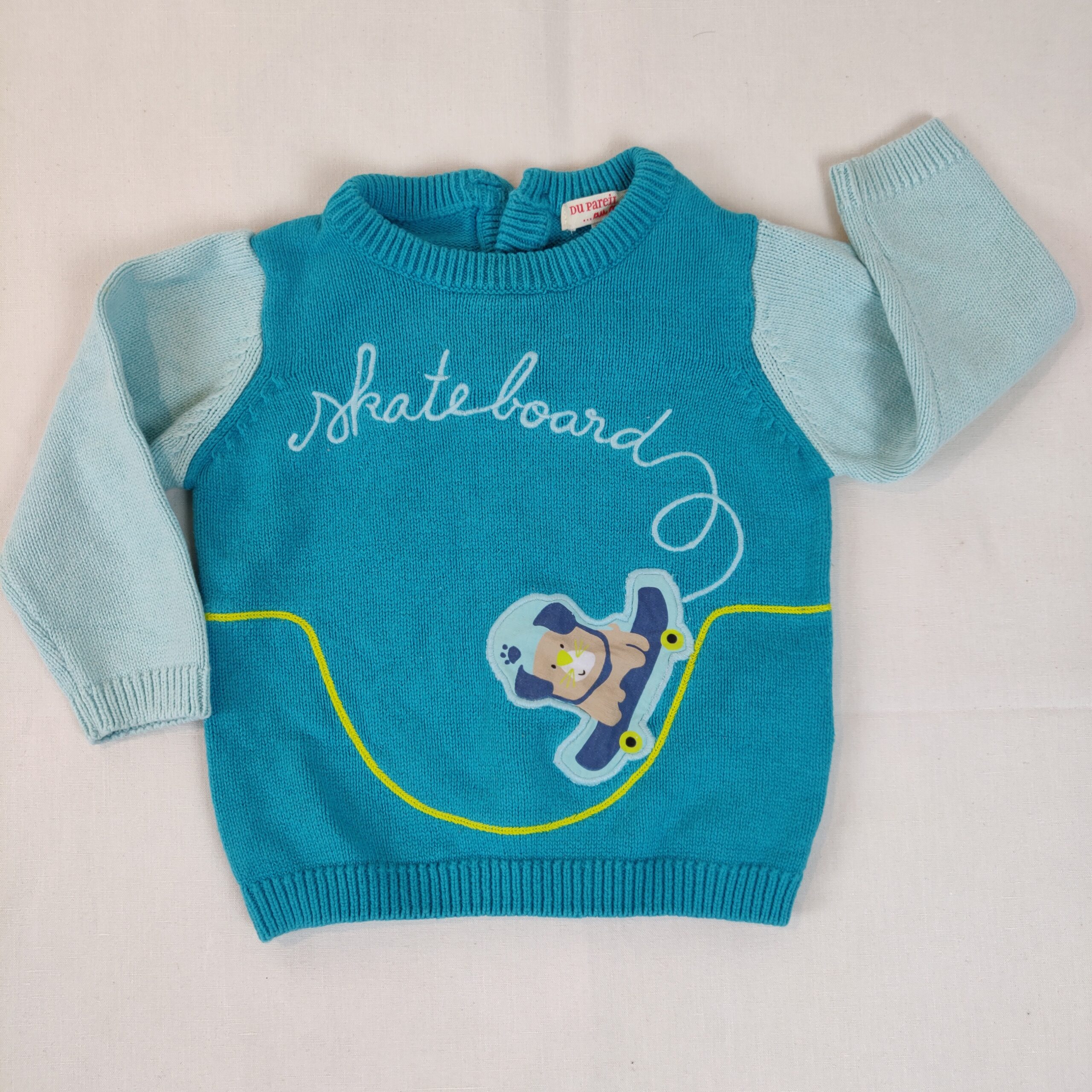 Autres commentaires : Pull bicolore – bleu turquoise, manches bleu clair – motif coloré chien qui fait du skate, inscription cousue « Skateboard ». Ouverture centrale dans le dos à 3 boutons classiques.