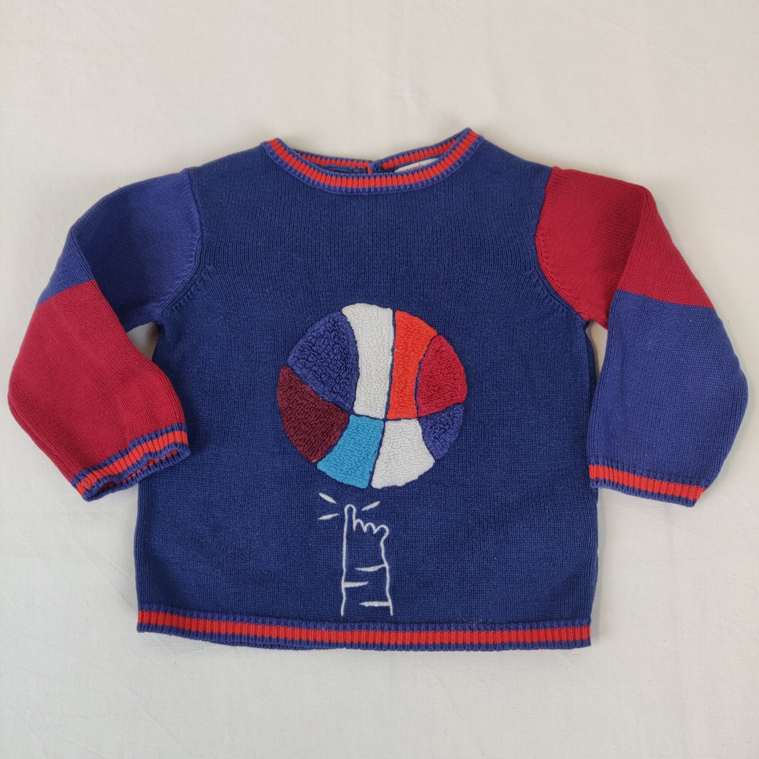 Autres commentaires : Un pull en fines mailles bleues et rouges. Motif central piqué ballon de basket multicolore. Ouverture centrale au dos à 3 boutons.