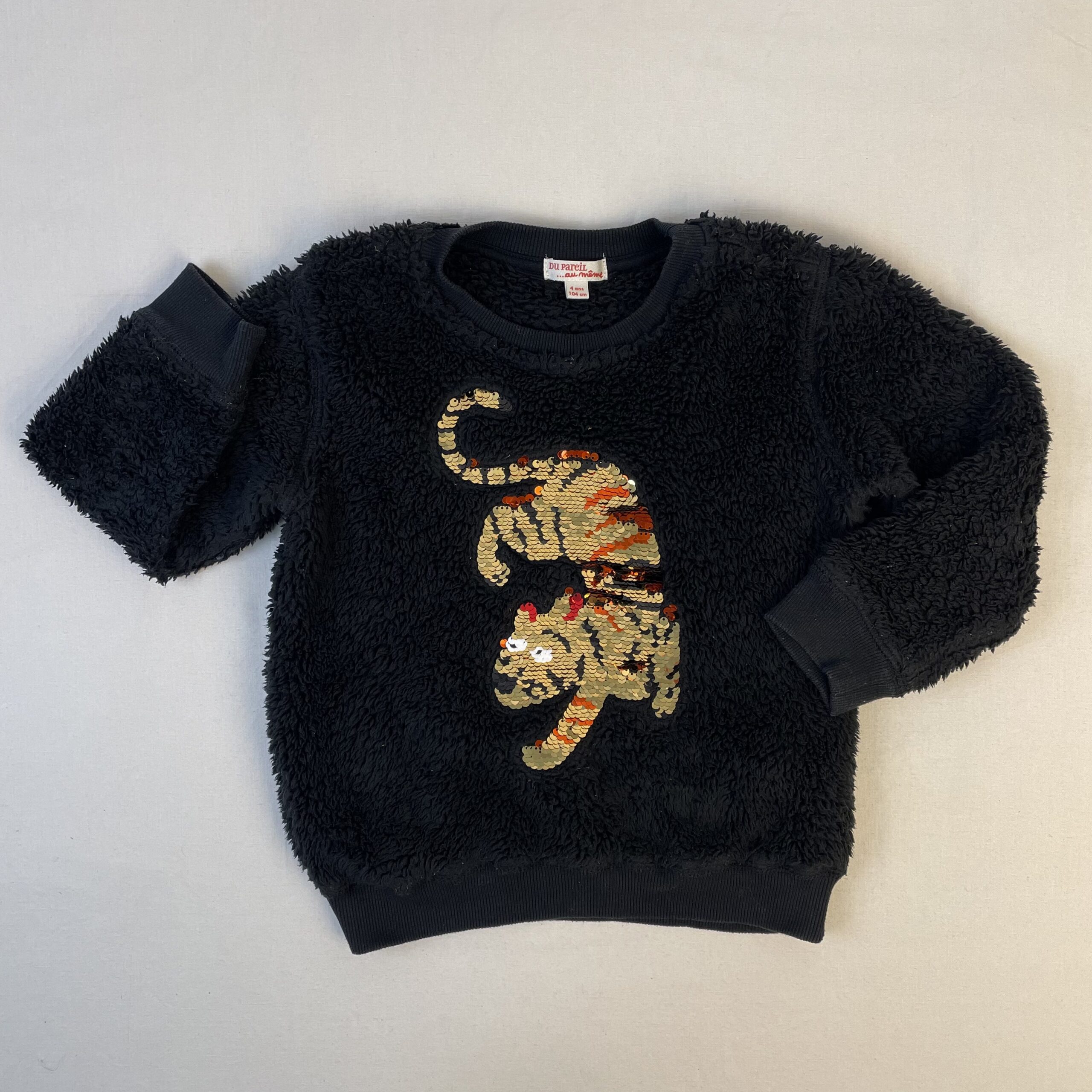 - Pull en fourrure synthétique noire, devant motif félin en sequins dorés.