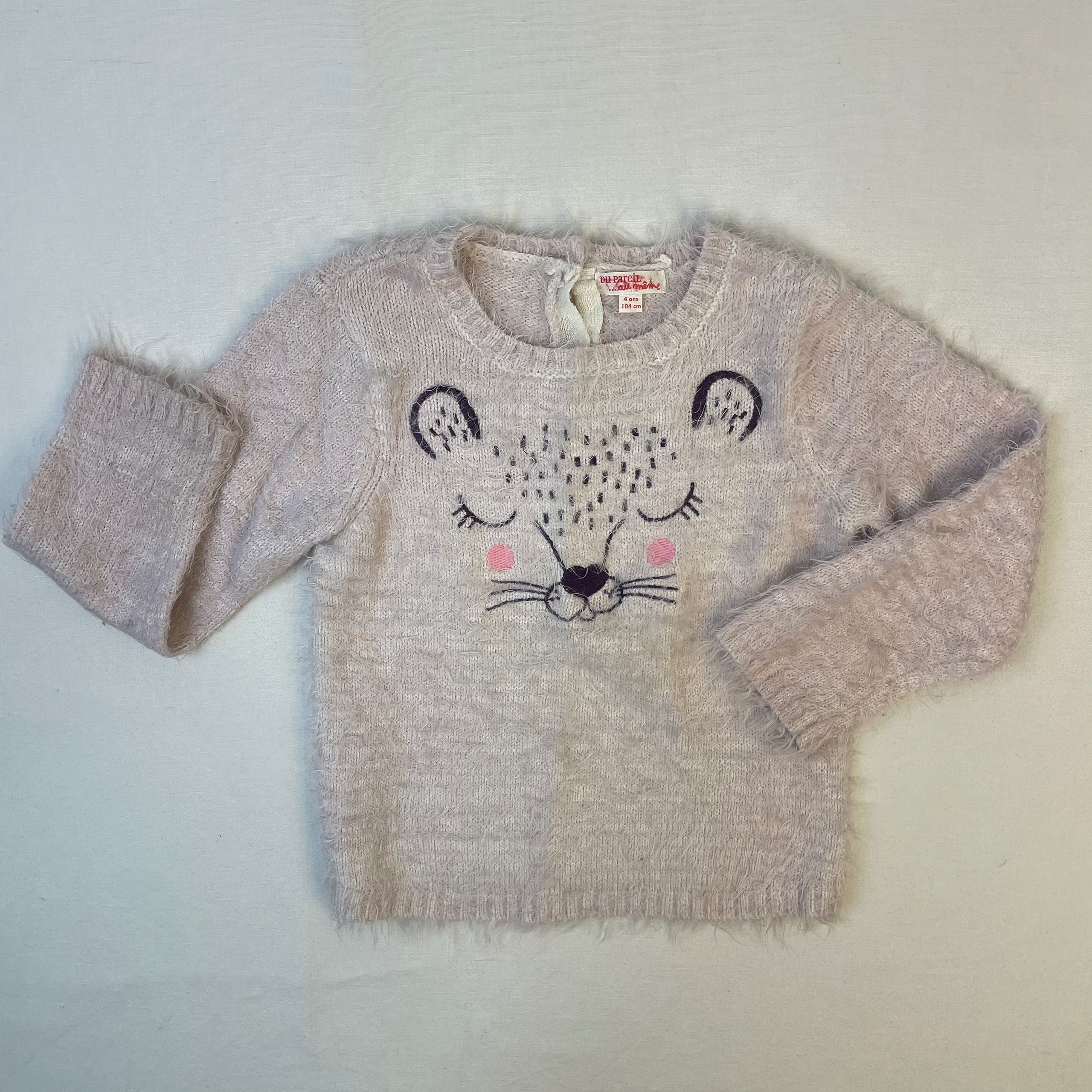 - Pull avec poils et motif lionceau, fermeture boutons en haut du dos.