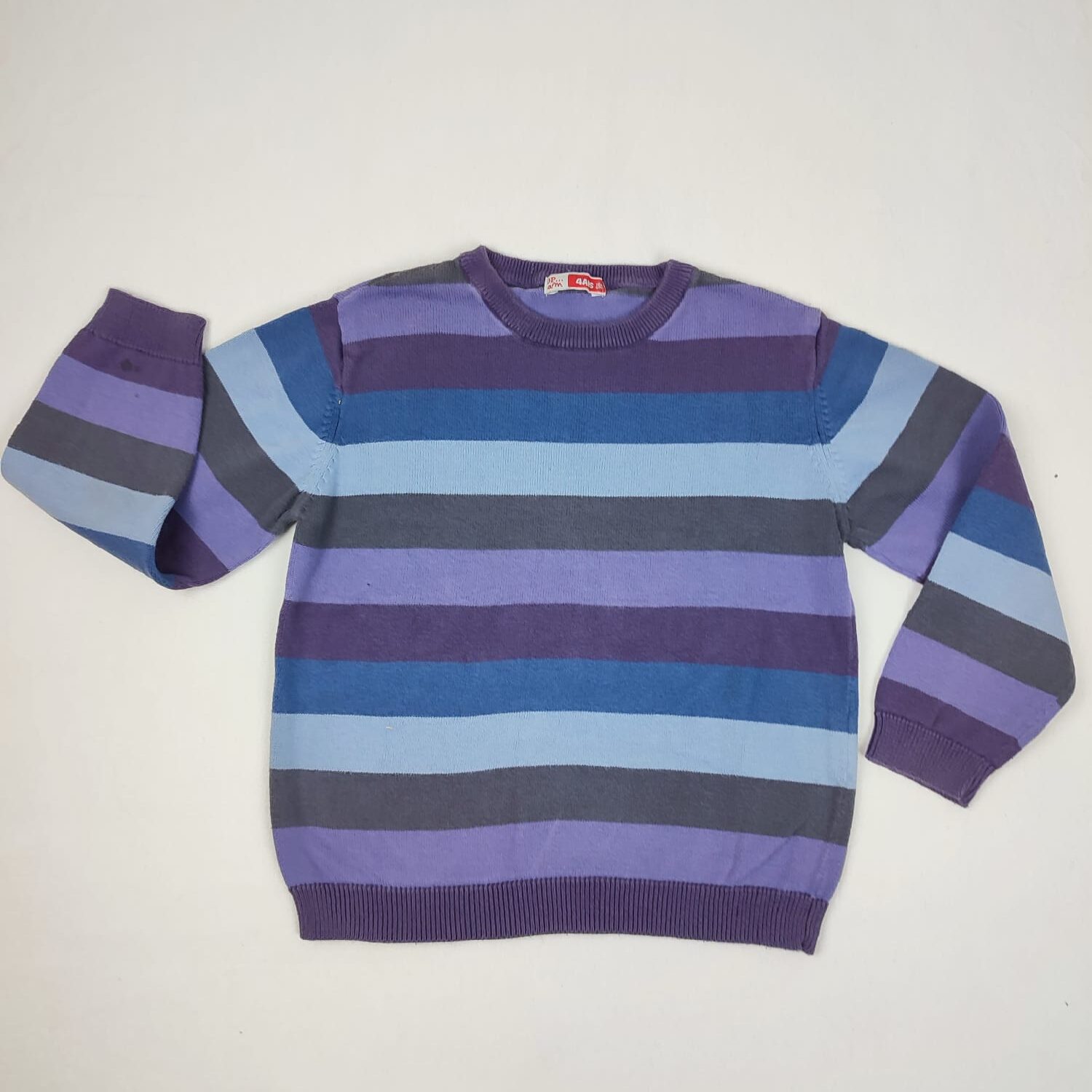 Autres commentaires : Pull en maille, rayé à bandes violettes, bleu indigo, bleu clair, marron glacé et mauves, col rond.