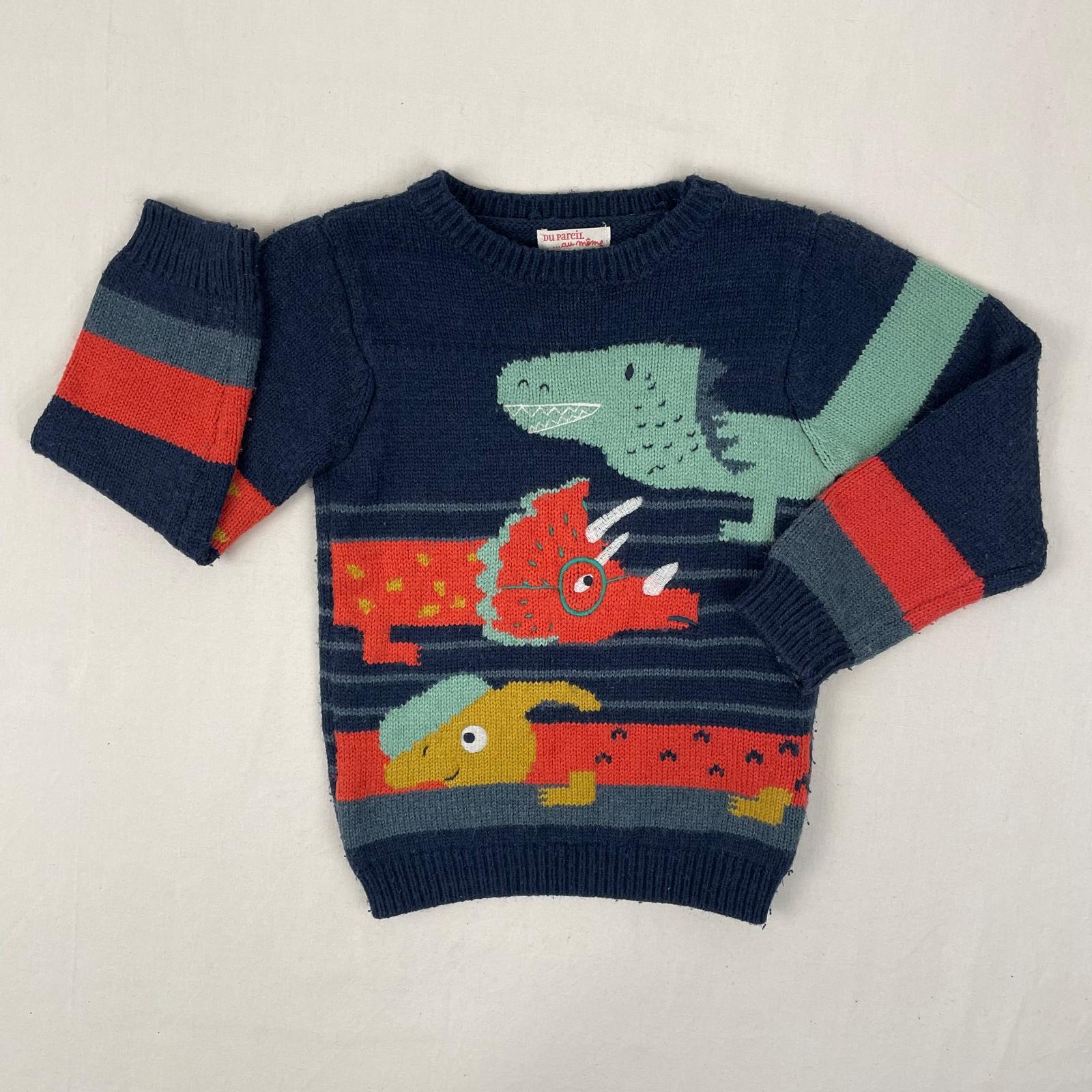 Autres commentaires : 41% polyamide. pull en maille bleu marine à col rond avec motifs dinausaures vert orange et jaune.
